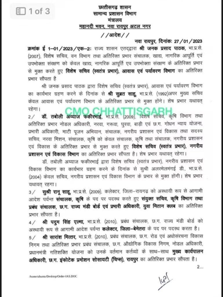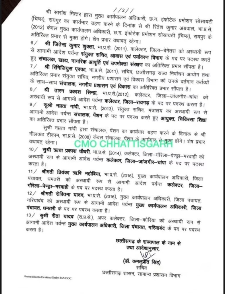/ शुक्रवार की देर रातIAS,IPS अधिकारियों को नए दायित्व देते हुए स्थानांतरण सूची जारी की गई जिसमे 13 IAS, 8 IPS अफसर शामिल हैं। इनमें से 2 पुलिस अधिकारियों को अतिरिक्त पुलिस अधीक्षक से पुलिस अधीक्षक बनाया गया है. वहीं पुलिस अधीक्षक राजनांदगांव प्रफुल्ल ठाकुर को मुख्यमंत्री भूपेश बघेल की सुरक्षा का जिम्मा दिया गया है. ट्रांसफर सूची के अनुसार कुल 7 जिलों के पुलिस अधीक्षक बदल गए हैं. इसके साथ ही 13 IAS अफसरों के तबादले किए गए हैं, जिसमें 4 जिलों के कलेक्टर बदल गए है ।