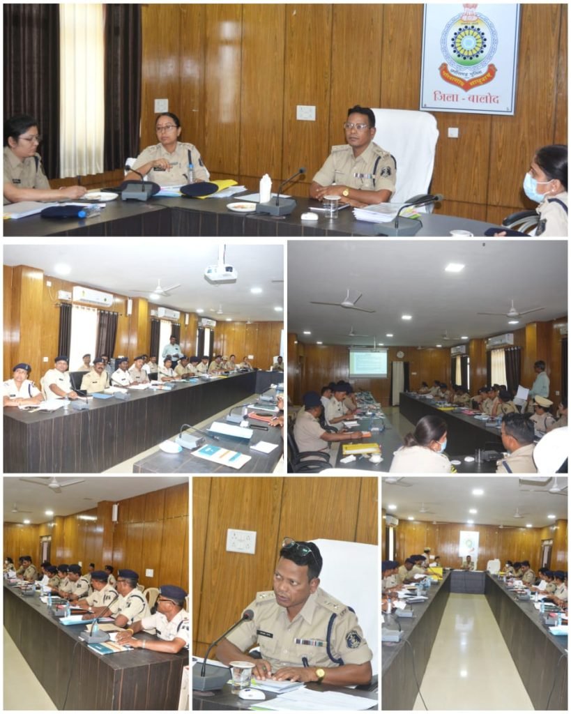 जिला पुलिस कार्यालय बालोद में पुलिस अधीक्षक एसआर भगत के निर्देशन में समस्त राजपत्रित अधिकारी एवं थाना प्रभारियों के मध्य क्राइम मीटिंग आयोजित हुई। उक्त मीटिंग में लंबित चालान का निकाल, लंबित प्रकरणों पर कार्यवाही, गुम इंसान की जानकारी, पेंडिंग शिकायत का निराकरण, अपराध पर अंकुश लगाने पेट्रोलिंग, अवैध कारोबार पर कार्यवाही करने, चोरी नकबजनी पर लगाम कसने एवं अज्ञात आरोपियों की पता तलाश उनकी गिरफ़्तारी, साइबर फ्रॉड रोकथाम एवं आईटी एक्ट के प्रकरणों पर उचित कार्यवाही हेतु समस्त अधिकारीयों को निर्देश दिए गए। साथ ही आगामी लोकसभा चुनाव के मद्देनजर जिले में कानून एवं सुरक्षा व्यवस्था मजबूत करने समेत अन्य महत्वपूर्ण मुद्दों पर भी चर्चा हुई।