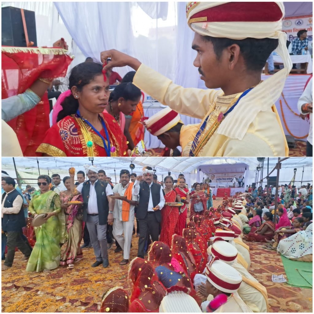 फरसगांव – फरसगांव में सोमवार को महिला एवं बाल विकास विभाग द्वारा मुख्यमंत्री कन्या विवाह योजना अंतर्गत सामूहिक विवाह कार्यक्रम का आयोजन किया गया। जिसमें जिले के 120 जोड़ो का विवाह विधायक केशकाल नीलकंठ टेकाम की उपस्थिति में संपन्न किया गया। इस अवसर पर 120 दूल्हों की बारात गाजे बाजे के साथ बारात निकाली गयी। जिसमें परिजनों के साथ जनप्रतिनिधि और फरसगांव के नागरिक भी बाराती बन कर नाचते दिखाई दिए। जिनका पूरे रीति रिवाज के साथ स्वागत किया गया।