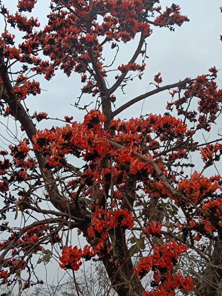फूलों से लदा टेशु का वृक्ष आने वाले रंगों का त्यौहार फागुन की याद दिला देते हैं,, भारतीय तीज त्योहारो में प्रकृति भी अपनी अकल्पनीय छटा बिखेर कर बहुत ही बेसब्री से त्योहारों की प्रतीक्षा में रहते हैं, वैसे तो फागुन त्यौहार में पलाश के फूलों का एक अलग ही महत्व है,, बुजुर्गों से सुना है कि इसके फूलों से अतीत में रंग बनाकर होली खेला जाता था! अब तो बाजारों में अनेक प्रकार के रंग आ चुके हैं जिससे इस फूल की महत्ता कम हो चुकी है, देखा जाए तो अतीत में होली की शुरुआत महीने भर पहले से हो जाती थी, प्रत्येक गांव के चौपाल पर गांव के बड़े बुजुर्ग और युवा इकट्ठे होकर फाग की धुन पर नाचते और गाते थे, फागुन के रंग से शहर भी अछूता नहीं था,, अब धीरे-धीरे भारतीय त्योहारों की महत्ता भी कम होते जा रही है, अब पहले जैसे त्योहार के लिए तैयारी नहीं रहती लोग अपने आप को एडवांस दिखाने की चाह में रंगों से भी परहेज करने लग गए रही सही कसर प्रशासनिक अमला पूरी कर दे रही है, क्या साल में एक बार आने वाले त्योहार के लिए इतनी प्रशासनिक कसावट सही है, सिर्फ बोर्ड का पेपर है करके या कुछ और यदि संस्कृति ही नहीं रहेगी तो संस्कार कहां से ,,