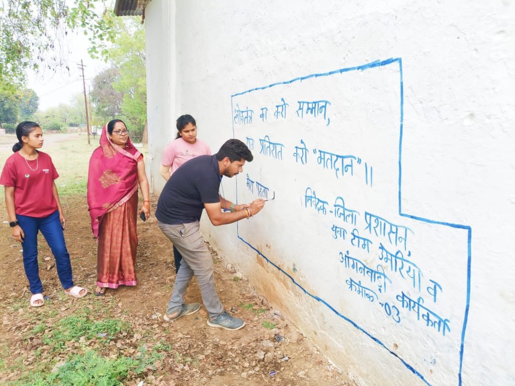 उमरिया- मतदाता जागरूकता अभियान के कलेक्टर व जिला निर्वाचन अधिकारी धरणेन्द्र कुमार जैन के निर्देशन व मार्गदर्शन पर जिले की सक्रिय युवाओं की टोली युवा टीम उमरिया के द्वारा ग्राम पंचायत गौरइया के दीवारों पर मतदाता जागरूकता नारे लिखे लोगों को मतदान करने हेतु जागरूक व प्रेरित कर रहे।