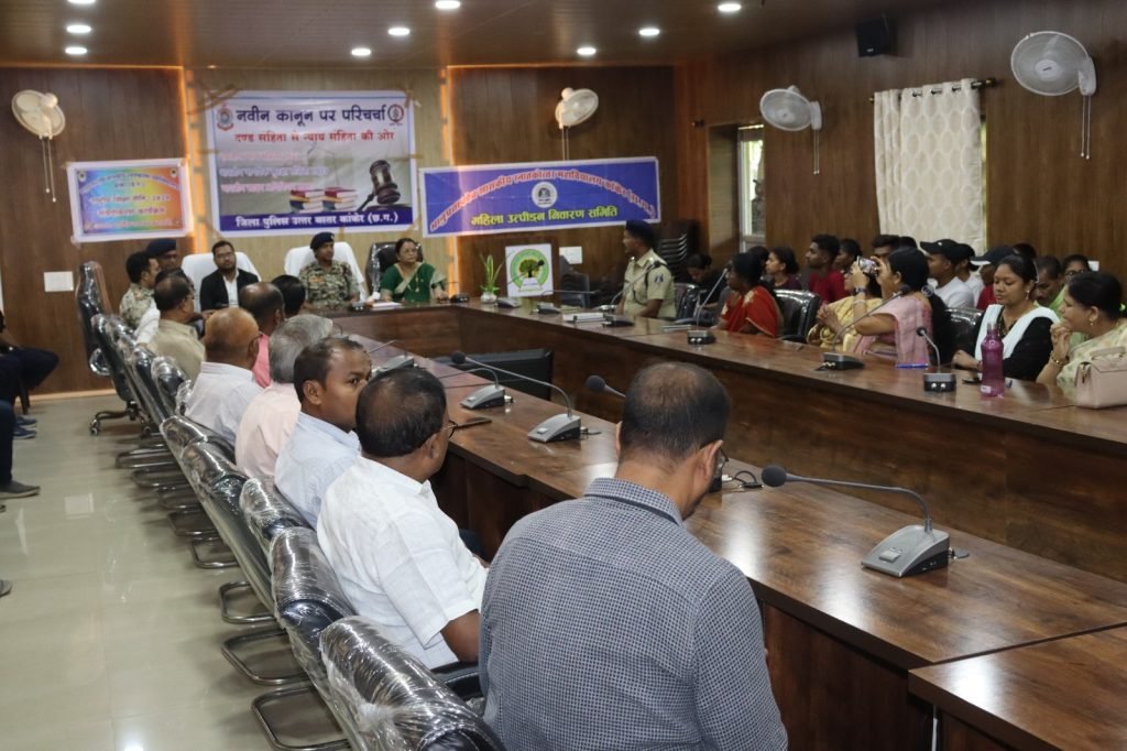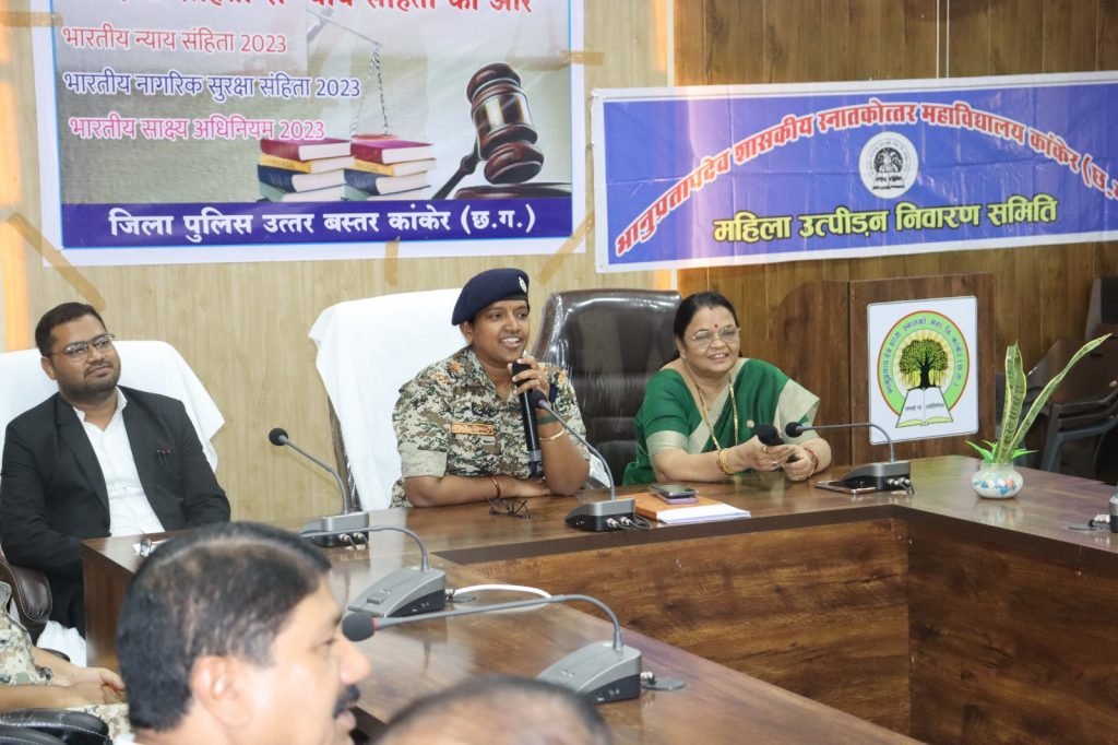 वरिष्ठ पुलिस अधीक्षक कांकेर इंदिरा कल्याण ऐलिसेला के निर्देशन में आज दिनांक 26.06.2024 को पीजी काॅलेज कांकेर में नवीन कानून के संबध में अध्यापक एवं छात्र – छात्राओं को जानकारी दिया गया एवं अन्य लोगों को भी नया कानून के बारे जानकारी देने कहा गया एवं नये कानूनों के निम्नलिखित उदेशयों के बारे मे बताया गया जिसमें औपनिवेशिक कानूनों मे बदलाव , नागरिक केन्द्रित एवं कल्याणकारी अवधारणा, प्राथमिकता का निर्धारण, महिला सुरक्षा एवं न्याय ,आतंकवाद, संगठित अपराध एवं भारत की संप्रभुता,एकता एवं अखण्डता के विरूध अपराध पीड़िता केन्द्रिय कानूनी प्रावधान, अनुसंधान में वैज्ञानिक तकनीक, डिजीटल एवं इलेक्ट्रानिक साक्ष्य के प्रावधान, न्यायालयीन प्रक्रिया से संबंधित प्रावधान, E-FIR और 0-FIR के बारे में भी बताया गया इस दौरान श्रीमती मनीषा ठाकुर रावटे अतिरिक्त पुलिस अधीक्षक कांकेर, श्रीमती डाॅ. सरला अतराम प्राचार्या पी.जी. कालेज कांकेर, मोहसीन खान अनु.अधि. कांकेर, अविनाष ठाकुर उप पुलिस अधीक्षक डीआरजी, मनीष नागर थाना प्रभारी, लक्ष्मी नारायण नामदेव उप निरीक्षक थाना कांकेर, छत्रपाल सिंह अधिवक्ता कांकेर एवं कालेज के अन्य प्रोफेसर भी उपस्थित रहे।