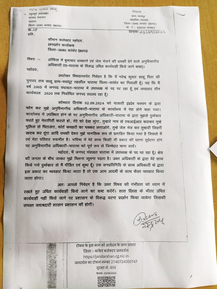 छत्तीसगढ़ राज्य प्रशासनिक सेवा के अधिकारी व चारामा के नवपदस्थ अनुविभागीय अधिकारी राजस्व के उपर जनपद पंचायत चारामा के पूर्व उपाध्यक्ष नरेंद्र साहू ने बेहद गंभीर आरोप लगाया है । उन्होनें जिला मुख्यालय कांकेर मे मंगलवार 3 सितंबर को आयोजित कलेक्टर जनदर्शन कार्यक्रम में मामले की शिकायत भी कर दी है । उन्होने अधिकारी पर गंभीर आरोप लगाते हुए अपने शिकायत पत्र में लिखा है कि उन्हें 2 सितंबर को अधिकारी के द्वारा अपने सरकारी कार्यालय में बुलवाकर उस पर एफआईआर दर्ज करवाकर पुलिस से पिटवाने,जेल भेज देने और देख लेने तक की धमकी दी गई है । उन्होनें कहा है कि अधिकारी के द्वारा इस तरह की धमकी देकर उसे मानसिक रुप से प्रताड़ित किया जा रहा है । घटना के बाद से वे और उनका परिवार पूरी तरह से भयभीत हैं । इसलिए उन्होने कलेक्टर कांकेर से जनदर्शन कार्यक्रम में शिकायत करते हुए घटना से अवगत कराया है । वहीं उनके साथ निकट भविष्य में किसी भी प्रकार की घटना दुर्घटना होती है तो उसके लिए उक्त अधिकारी को दोषी करार देने का आग्रह किया गया है और अधिकारी की धमकी व इस शिकायत पत्र की गंभीरता को देखते हुए शीघ्र कार्यवाही करने की मांग की गई है । वहीं 7 दिवस के भीतर कार्यवाही नही की जाती है तो ऐसी स्थिति में धरना प्रदर्शन करने की भी बात कही गई है । जिसकी समस्त जवाबदेही शासन-प्रशासन की मानी जाएगी ।