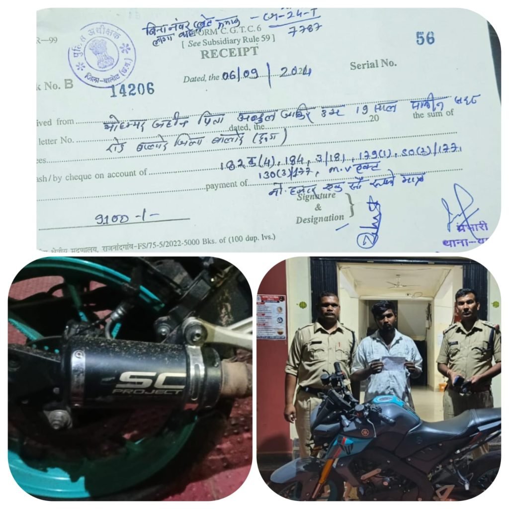 बालोद । पुलिस महानिरीक्षक दुर्ग रेंज रामगोपाल गर्ग, बालोद जिला पुलिस अधीक्षक एस.आर.भगत, अतिरिक्त पुलिस अधीक्षक अशोक कुमार जोशी, पुलिस अनुविभागीय अधिकारी बालोद देवांश सिंह राठौर के मार्ग दर्शन में बालोद थाना निरीक्षक रविशंकर पाण्डेय के द्वारा लगातार खतरनाक ढ़ग से बाईक चलाने वालो पर कार्यवाही जारी है इसी के चलते आज सदर बाजार निवासी मोहम्मद जहीन उम्र 19 साल, के विरूद्व धारा 182 (के) 4, 183, 3/181 179/1 50/2 177mv एक्ट के तहत 9100 रू का चालानी कार्यावाही कि गई है उक्त युवक के खिलाफ पुलिस में शिकायत आयी थी जिसके आधार पर यह कार्यवाही की गई है थाना निरीक्षक रविशंकर पांडे ने बताया कि बालोद शहर में ऐसे और भी नवयुवक है जिनके खिलाफ लगातार नगरवासियों द्वारा शिकायत की जा रही है ऐसे युवकों पर पुलिस की पैनी नजर है माडी फाइड गाड़ियों में तेज आवाज साइलेंसर लगाकर शहर में तेज रफ्तार वाहन चलाने वालों पर आगे भी इसी तरह कार्यवाही की जाएगी उसके बाद भी अगर युवक अपनी मनमानी से बाज नही आये तो फिर आगे कठोर कार्यवाही की जाएगी उक्त कार्यवाही में यातायात निरीक्षक राकेश ठाकुर संतोष ठाकुर अरविंद सिंग का सहयोग रहा