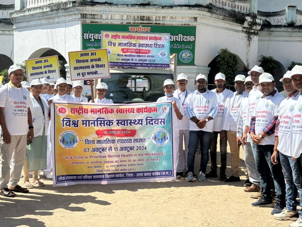 कांकेर। विश्व मानसिक स्वास्थ्य दिवस 10 अक्टूबर के अवसर पर डॉ. महेश सांडिया (मुख्य चिकित्सा एवं स्वास्थ्य अधिकारी डॉ. किशोर कुमार ध्रुव एवं रोहीत वर्मा जिला कार्यक्रम प्रबंधक के निर्देशानुसार ज़िला चिकित्सालय कांकेर से प्राचार- प्रसार रथ के साथ मेडिकल कॉलेज के स्टूडेण्ट व नर्सिंग कॉलेज के स्टूडेंट ने रैली निकाली. रैली शहर के पुराने बस स्टैंड से वापस जिला अस्पताल पहुंची। तदोपरांत सभी स्टूडेंट को मानसिक स्वास्थय की जानकारी देने हेतु डॉ. विमल भगत (सायकेट्रिक) अस्पताल अधीक्षक, डॉ. लोकेश कुमार देव को आमंत्रित किया गया था । उक्त कार्यक्रम में डॉ. योगेश प्रजापति (ज़िला सलाहकार एनसीडी), राकेश राजपूत फाइनेंस एवं लॉजिस्टिक अधिकारी एनसीडी, डॉ. विनोद वैद्य ज़िला सलाहकार एनपीपीसीएफ, आशीष जैन सायकेट्रिक नर्स, खगेन्द्र पटेल स्टाफ़ नर्स एवं अन्य कर्मचारी उपस्थित थे ।..