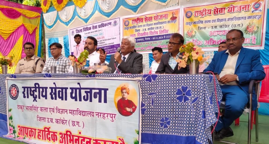 शिविर के तृतीय दिवस दिनॉक 07/11/2024 को बौद्धिक चर्चा सत्र कार्यक्रम में प्रो. मनोज कुमार श्रीवास्तव कुलपति, शहीद महेन्द्र कर्मा विश्वविद्यालय बस्तर जगदलपुर मुख्य वक्ता मान. वरिष्ठ न्यायधीश श्री भास्कर मिश्रा जिला सत्र न्यायालय कांकेर, श्री सुरेश राठौर, थाना प्रभारी थाना नरहरपुर, विशिष्ट अतिथि डॉ.डी.एल.पटेल, कार्यक्रम समन्वयक रासेयो, डॉ अभिषेक मिश्रा जिला संगठक रासेयो, जिला कांकेर, सुश्री अंजू रावटे अनुविभागीय अधिकारी प्रधानमंत्री ग्राम सड़क योजना कांकेर, श्री मेघचन्द देवांगन उद्यान अधीक्षक कन्हनपुरी, एवं अन्य कार्यक्रम अधिकारियों का आगमन शिविर में हुआ।