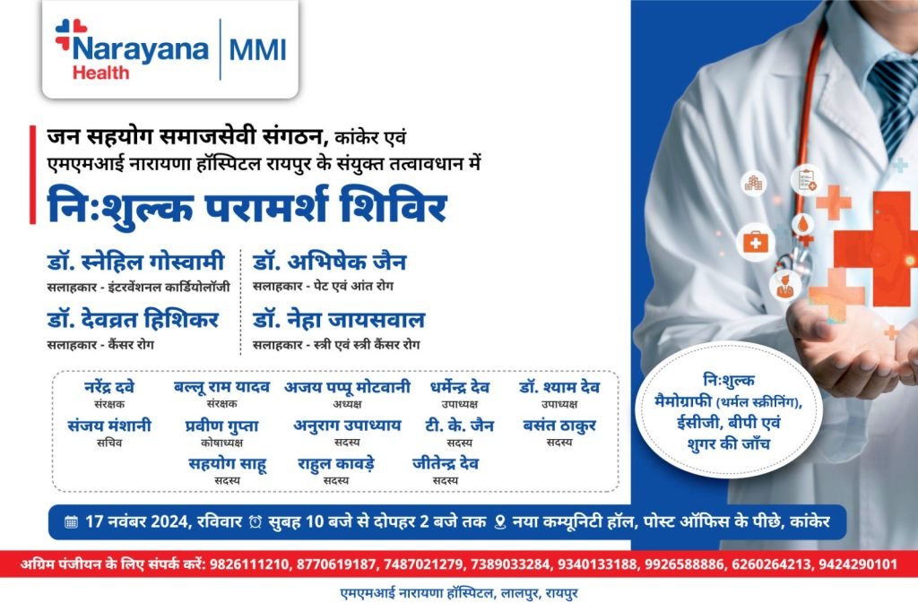 काँकेर । शहर की “जनसहयोग” समाजसेवी संस्था एवं रायपुर के विख्यात अस्पताल एमएमआई नारायणा के संयुक्त तत्वावधान में आगामी 17 नवंबर रविवार को पोस्ट ऑफिस के पीछे नए कम्युनिटी हॉल में स्वास्थ्य जांच एवं परामर्श शिविर का आयोजन किया गया है , जिसमें देश के जाने-माने विशेषज्ञ चार डॉक्टर स्नेहिल गोस्वामी, डॉक्टर अभिषेक जैन डॉक्टर देवव्रत हिशिकर, डॉ नेहा जायसवाल आदि का आगमन हो रहा है ,जो हृदय रोग, उदर रोग, कैंसर तथा स्त्री रोगों के जाने-माने विशेषज्ञ हैं। इस शिविर में मैमोग्राफी (थर्मल स्क्रीनिंग) बी पी, शुगर आदि की भी नि:शुल्क जांच की जाएगी। समय, सुबह 10:00 बजे से दोपहर 2:00 तक निर्धारित किया गया है। अग्रिम पंजीयन हेतु निम्नांकित नंबरों पर संपर्क किया जा सकता है:— 98261 11210 , 87706,19187, 7487021279, 738 90 33284, 93401 33188, 99265 88886, 62602 64213, 94242 90101,7771028734 ,,,