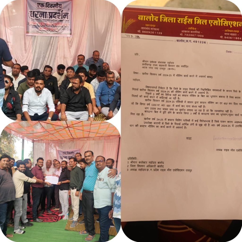 बालोद । बालोद जिला के समस्त राइस मिल मालिक विभिन्न समस्याओं के निराकरण की मांग को लेकर आज एक दिवसीय धरने पर बैठ गए हैं जिला राइस मिल एशोसियेशन के अध्यक्ष ताराचंद सांखला ने बताया कि सभी राइस मिलर्स खरीफ फसल वर्ष 2024 एवं 2025 के लिए मिलिंग कार्य करने में असमर्थ है उन्हें पिछले 3 सालों का विभिन्न मदो से मिलिंग कार्य का भुगतान नही किया है जिससे मिल मालिकों को मिल चलाने से लेकर अनेक तरह की समस्या का सामना करना पड़ रहा है वहीं पहले मिलिंग कार्य 120/-₹ दिया जाता था जिसे आधा करके केवल 60/₹ कर दिया गया है ऐसे में कैसे मिल मालिक मिलिंग कार्य करेंगे वहीं उन्होंने आगे बताया कि धान के उठाव एवं मिलिंग पश्चात चांवल जमा करने में किसी कारण वश देर होने पर जुर्माना भी लगाया जाता है जो कि न्यायसंगत नही है वहीं बारदाना बिल में त्रुटि होने के चलते 3 सालों से उसका भुगतान और यूजर चार्जेस भी नही मिला है खरीफ फसल 2024 – 25 में शासन के द्वारा बनाये गए नियमो में विरोधाभास नजर आ रहा है ऐसे में मिल मालिकों को आर्थिक परेशानियों का सामना भी करना पड़ रहा है इन सब मांगो को समय रहते पूर्ण नही किये जाने की स्थिति में मिल मालिक आगे मिलिंग कार्य नही करेंगे इन सबकी जवाबदारी भी शासन और प्रशासन की होगी