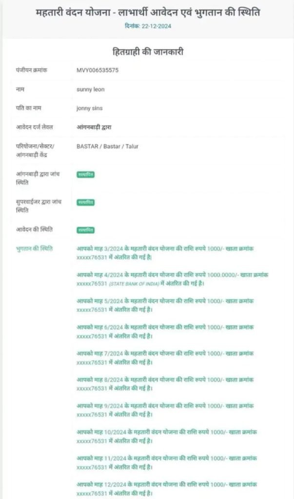 दरहसल छत्तीसगढ़ में एक युवक ने फर्जी तरीके से शून्य लियोन के नाम से महतारी वंदन में अकाउंट बनाया था जिसमें प्रति माह 1000 रुपए डाल रहे थे।बस्तर के तालुर गांव के एक युवक ने फर्जी अकाउंट बनाया था फिलहाल युवक की शिनाख्त कर ली गई है और FIR भी दर्ज कर ली गई है।गौरतलब है कि आवेदन को सुपरवाइजर और आंगनबाड़ी कार्यकर्ता ने अप्रूव किया था।