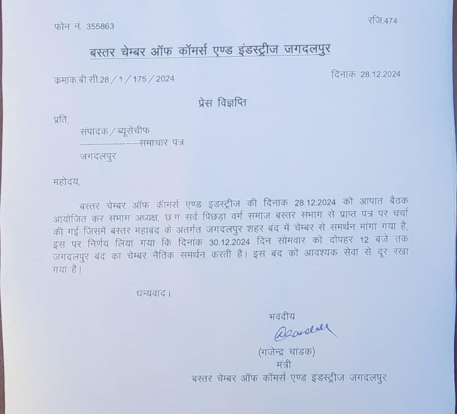 इसी क्रम में ओबीसी वर्ग की सामाजिक संगठन भी आगे आती दिख रही है जिसमें बस्तर संभाग ओबीसी महासभा के पदाधिकारी व सभी ओबीसी वर्ग के लोगों ने भी अपना रोष व्यक्त किया है।इस तारतम्य में बस्तर संभाग जिला मुख्यालय जगदलपुर में ओबीसी महासभा 29 दिसंबर को धरना प्रदर्शन करेगी और 30 दिसंबर को बस्तर बंद जैसे उग्र आंदोलन व्यक्त करेगी।ज्ञात हो कि 20 दिसंबर को जगदलपुर जिला कलेक्ट्रेट कार्यालय में नगरीय निकाय चुनाव हेतु आरक्षण का आवंटन किया गया था जिसमें ओबीसी वर्ग के लिए 9 वार्डो में आरक्षण सुरक्षित रखा गया है।