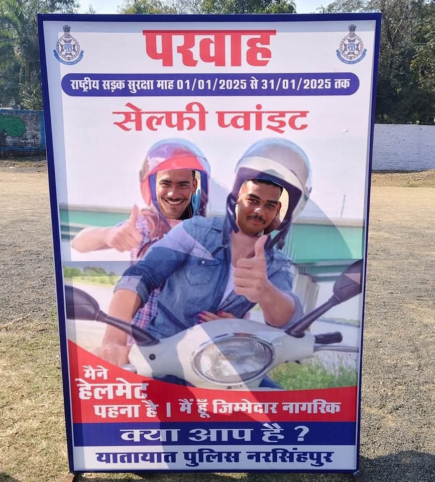 हेलमेट जागरूकता हेतु लगाए गए सैल्फी प्वाइंट :- जिला अंतर्गत दो पहिया वाहन चालाकों को वाहन चलाते समय हेलमेट कों धारण करने हेतु जागरूक किया गया साथ ही जागरूकता हेतु विभिन्न स्थानों में सेल्फी प्वाइंट लगाए गए है।