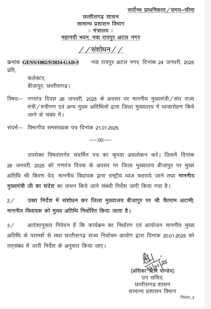 ब्रेकिंग न्यूज़ गणतंत्र दिवस 2025 बीजापुर जिलामुख्यालय में किरण देव नहीं स्थानीय विधायक चैतराम अटामी होंगे मुख्य अतिथि Express MPCG Jan 25, 2025 0 गणतंत्र दिवस 2025 बीजापुर जिला मुख्यालय में किरण देव नहीं स्थानीय विधायक चैतराम अटामी मुख्य अतिथि होंगे…