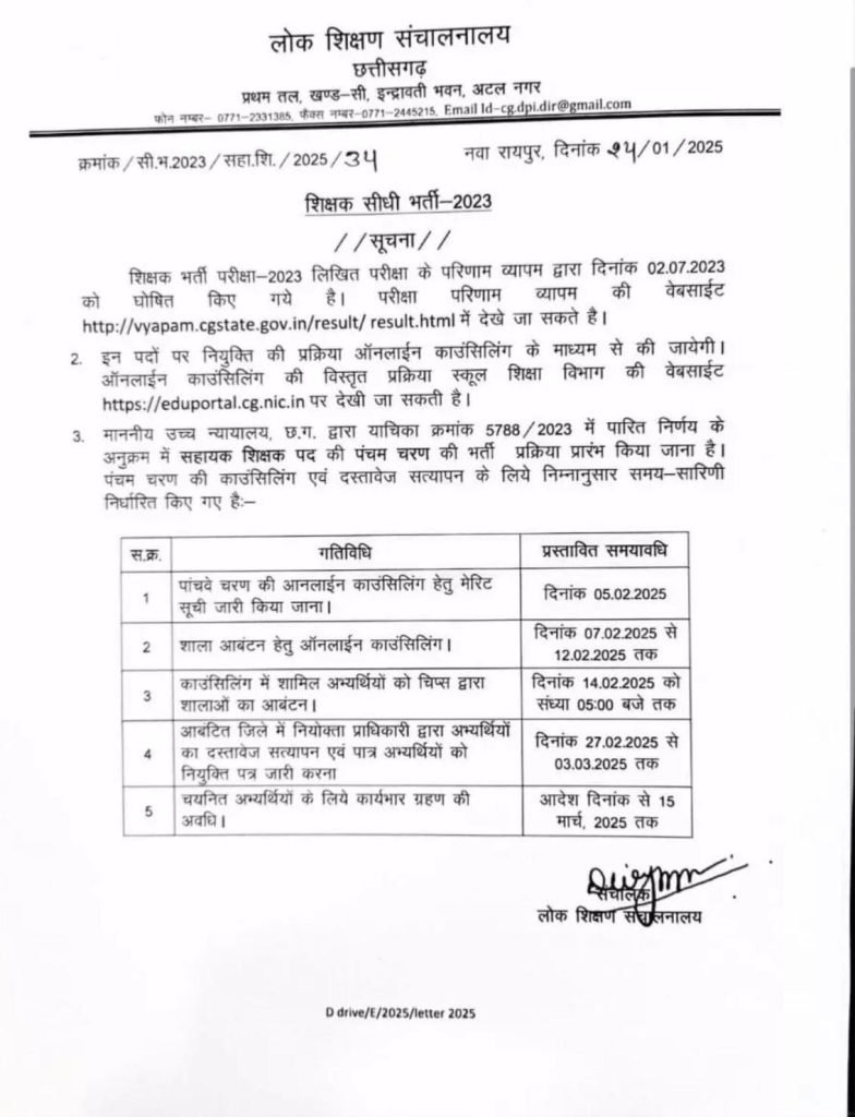 रायपुर / सहायक शिक्षक के पदों पर नियुक्त बीएड अर्हताधारी के स्थान पर नियुक्ति डीएड अहर्ताधारियो जो वरीयता सूची में होगे उनकी भर्ती की प्रक्रिया 5 फरवरी से होगी प्रारंभ पदस्थापना ,तत्संबंधी आदेश लोकशिक्षण संचालनालय छत्तीसगढ़ रायपुर ने जारी की है जिसमें पूरी प्रक्रिया की तिथि निर्धारित की गई है।