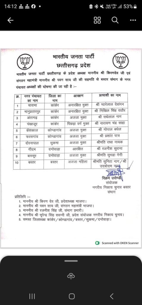 फरसगांव – नगर पंचायत चुनाव हेतु भाजपा ने 26 जनवरी रविवार को भाजपा प्रदेशाध्यक्ष किरणदेव एवं संगठन मंत्री पवन साय की सहमति से बस्तर संभाग के नगर पंचायत अध्यक्ष उम्मीदवारों की घोषणा की है। जिसमें फरसगांव नगर पंचायत हेतु प्रशांत पात्र और केशकाल नगर पंचायत हेतु गोपाल बघेल के नाम पर मोहर लगा दी है। आपको बता दे कि प्रशांत पात्र फरसगांव नगर पंचायत के वार्ड क्रमांक 12 के पार्षद रह चुके है। लिस्ट जारी होने के बाद से प्रशांत पात्र के समर्थकों में खुशी का माहौल है।
