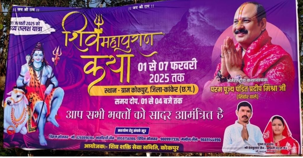 कांकेर/। शिव महापुराण कथा 1फरवरी से 7 फरवरी तक कांकेर के ग्राम कोकपुर में शिवशक्ति सेवा समिति के तत्वाधान में आयोजित है,जहां शिवपुराण के अन्तर्राष्ट्रीय कथावाचक पंडित प्रदीप मिश्रा (सीहोर वाले)कथा पाठ करेंगे । कथा का प्रतिदिन समय दोपहर 1 बजे से सांयकाल 4 बजे निर्धारित है ।