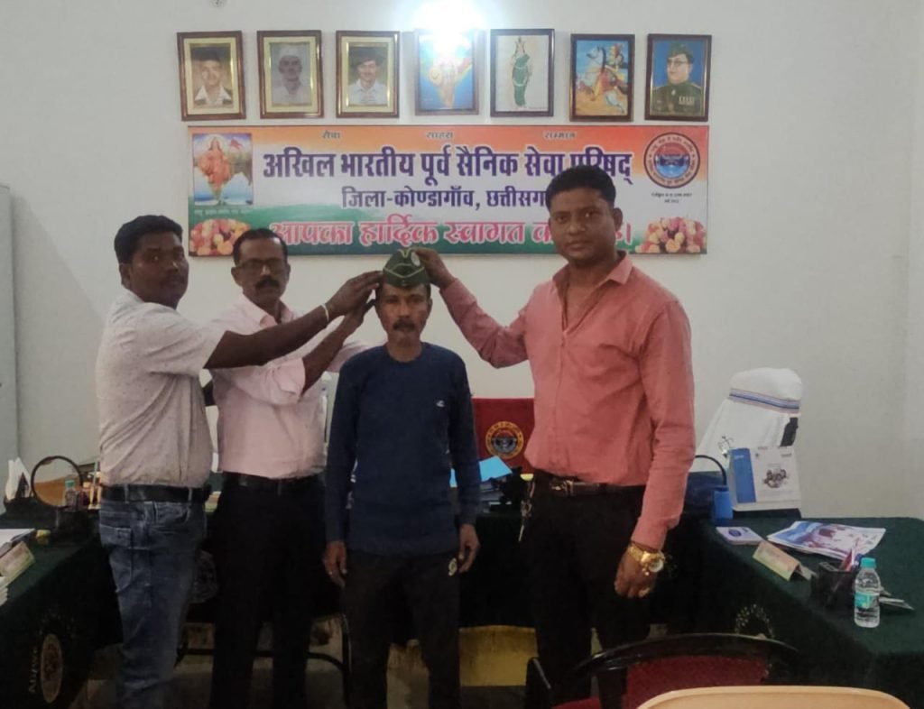दिनाँक 22 फरवरी 2025 को अखिल भारतीय पूर्व सैनिक सेवा परिषद कोंडागाँव के पदाधिकारियों द्वारा पूर्व सैनिक सार्जेंट मनोज बासु, पूर्व सैनिक हवलदार सोमलाल पोयाम और मातृशक्ति श्रीमती अनीता पोयाम को संगठन का राष्ट्रीय केप पहनाकर अखिल भारतीय पूर्व सैनिक सेवा परिषद कोंडागाँव का सदस्य बनाया गया