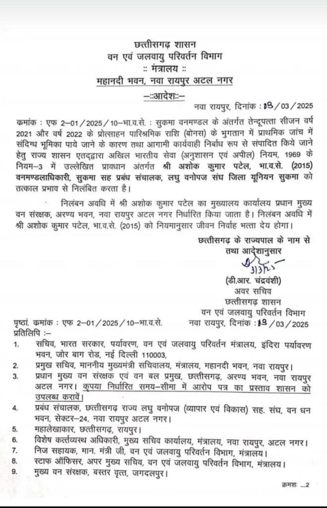 छत्तीसगढ़ शासन के वन एवं जलवायु परिवर्तन विभाग ने सुकमा वनमंडल के वनमंडलाधिकारी अशोक कुमार पटेल को निलंबित कर दिया है। यह कार्रवाई 2021 और 2022 में तेंदूपत्ता बोनस भुगतान में अनियमितता पाए जाने के बाद की गई है।