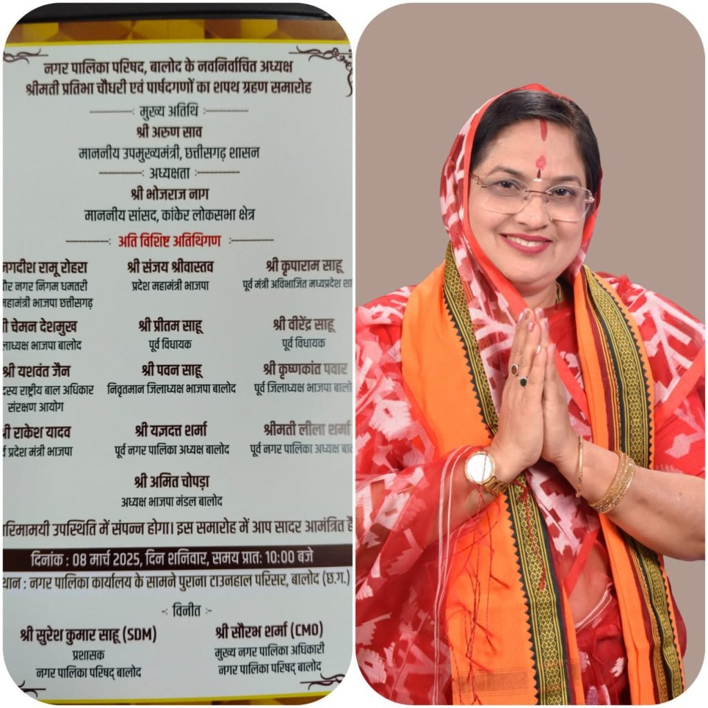 बालोद । बालोद नगर पालिका में 10 वर्षो बाद पुनः भाजपा का कब्जा हुआ है यहां भाजपा से पालिका अध्यक्ष प्रतिभा चौधरी ने शानदार जीत दर्ज की है 20 वार्डो वाला बालोद पालिका परिषद के नवनिर्वाचित अध्यक्ष सहित सभी 20 पार्षदों का 8 मार्च को शपथ ग्रहण होना है जिसमे प्रदेश के उपमुख्यमंत्री अरुण साव मुख्यअतिथि के रूप में शामिल होंगे शपथ ग्रहण की तैयारी को लेकर जहां प्रशासन अपने स्तर पर तैयारी कर रही है वही भाजपा कार्यकर्ता भी तैयारी को लेकर उत्साहित नजर आ रहे हैं इसी संदर्भ में आज भाजपा शहर मंडल के कार्यकर्ताओं की बैठक भी आयोजित की गई जिसमें सभी कार्यकर्ताओं को जिम्मेदारी भी दी गयी है