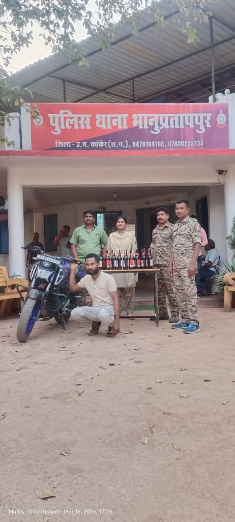 *कांकेर रोड अमित पोल्ट्री फार्म के सामने एक व्यक्ति द्वारा शराब रखकर ले जाने की सूचना पर थाना भानुप्रतापपुर पुलिस द्वारा आरोपी को घेरा बंदी कर गिरफ्तार किया*