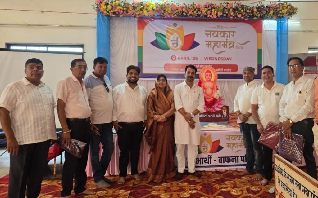 ९ – ग़रीबों की सेवा करना जैसे मुख्य बिंदु पर विस्तार से चर्चा की नवकार महामंत्र जाप के इस अवसर पर आज बालोद जैन समाज के आयोजन स्थल महावीर भवन में नगर पालिका अध्यक्ष प्रतिभा संतोष चौधरी उपाध्यक्ष कमलेश सोनी सभापति दीपक लोढा प्रीतम यादव पार्षद गिरिजेश गुप्ता भाजपा मंडल अध्यक्ष अमित चोपड़ा राकेश बाफना अजय बाफना शुभम श्रीश्रीमाल सहित अन्य कार्यकर्ता भी महामंत्र नवकार जाप में शामिल हुए तत्पश्चात भगवान महावीर स्वामी की प्रतिमा का दर्शन कर आशीर्वाद भी लिया सामूहिक नवकार महामंत्र जाप पर जैन समुदाय के लोगो के अलावा अन्य समाज के लोगो ने भी हिस्सा लिया नवकार जाप में शामिल लोगों का जैन श्री संघ के अध्यक्ष डॉ प्रदीप जैन सचिव मोहन नाहटा उपाध्यक्ष ताराचंद सांखला भगवान महावीर जन्म कल्याणक समिति के अध्यक्ष आकाश गोलछा ने आभार व्यक्त किया