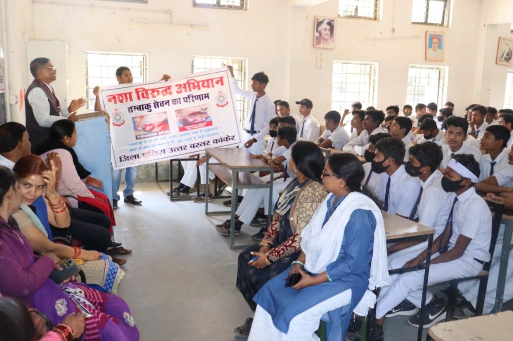 *लखनपुरी/चारामा* – शासन द्वारा तंबाकू निषेध, नशे के विरुद्ध चलाए जा रहे अभियान के तहत शनिवार को श्री शलभ कुमार सिन्हा पुलिस अधीक्षक कांकेर के निर्देशन व श्री अविनाश सिंह ठाकुर अतिरिक्त पुलिस अधीक्षक के मार्गदर्शन में शासकीय आदर्श उच्चतर माध्यमिक विद्यालय कानापोड़ लखनपुरी में तंबाकू प्रतिषेध व नशा के विरूद्ध अभियान, *अभिव्यक्ति ऐप नारी के सम्मान की* तथा अपराध रोकथाम की जानकारी प्राचार्य श्री ठाकुर व उपस्थित स्टाफ के समक्ष 250 बच्चों को तंबाकू प्रतिषेध नोडल अधिकारी (डी.सी.बी.) श्री दयालु राम साहू व स्टॉफ सुनील राजपूत, अरविंद राठौर द्वारा नशा गांजा, शराब, बीड़ी, सिगरेट, तंबाकू, गुटखा से होने वाले दुष्प्रभाव से घर परिवार समाज को होने वाली आर्थिक, शारीरिक, मानसिक व सामाजिक रुप से समाज में उत्पन्न होने वाले दुष्प्रभाव के संबंध में जानकारी देकर नशा मुक्त स्वस्थ परिवार व समाज का निर्माण करने की विस्तृत जानकारी दिया गया व महिला ऐप के माध्यम से महिलाओं पर होने वाली अपराध के संबंध में पुलिस थाना जाए बगैर पुलिस से सहायता प्राप्त करने के संबंध में जानकारी दिया गया। उपस्थित छात्र-छात्राओं व स्कूल स्टाफ द्वारा उक्त जानकारी देने के लिए शासन-प्रशासन का आभार व्यक्त किया गया।