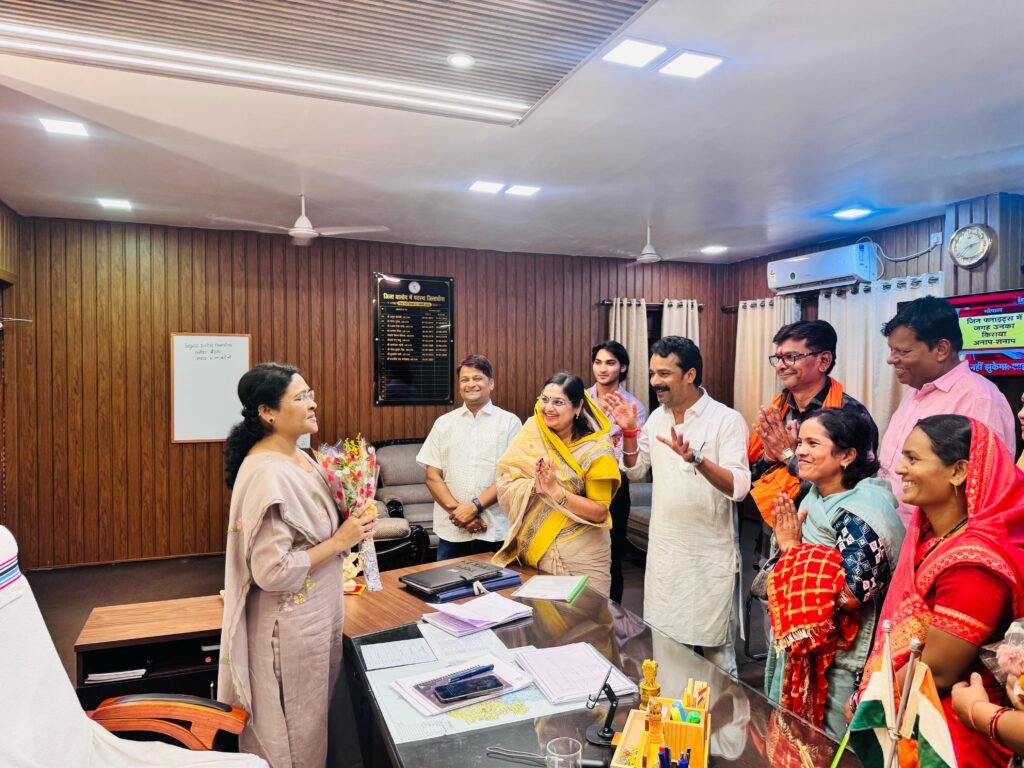 बालोद । बालोद नगर पालिका अध्यक्ष प्रतिभा चौधरी एवं उपाध्यक्ष कमलेश सोनी के नेतृत्त्व में आज परिषद के सभापति एवं पार्षदों ने बालोद जिले की नवपदस्थ कलेक्टर श्रीमती दिव्या मिश्रा से मुलाकात कर उनका स्वागत करते हुए सौजन्य परिचयात्मक भेंट किये इस अवसर पर पालिका अध्यक्ष प्रतिभा चौधरी ने बालोद शहर के विकास हेतु विस्तार से चर्चा किये जिसमे आगामी दिनों में शहर की जरूरत को ध्यान में रखकर विकास कार्य की रूपरेखा बताई वहीं पूर्व में मुख्यमंत्री जी के घोषणा के कार्यो पर भी चर्चा की गई शहर को विकसित एवं व्यवस्थित करने जिलाधीश ने भी अपने सुझाव दिए जिस पर हर सम्भव अमल करने का आश्वासन परिषद के सदस्यों ने दिया इस भेंट मुलाकात के अवसर पर नगर पालिका के सभापति दीपक जैन गोमती रात्रे गोकुल ठाकुर प्रीतम यादव श्यामा यादव पार्षद गिरिजेश गुप्ता सुनीता मनहर आशा पटेल पूर्व एल्डरमेन विनोद जैन भाजपा नेता महेश पाठक अमित दुबे देवेन्द्र पटेल आदि उपस्थित रहे