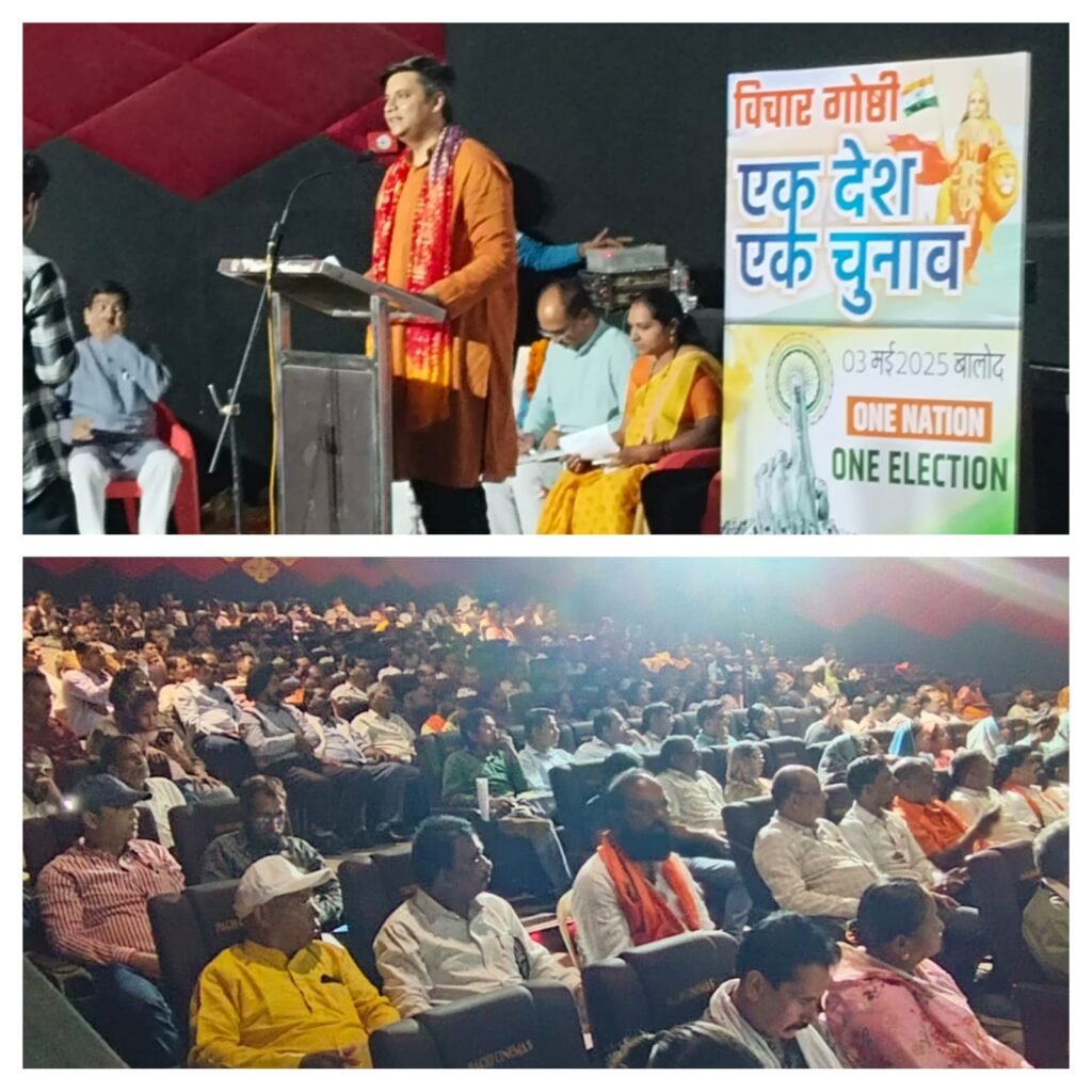 बालोद । पूरे भारत मे एक देश एक चुनाव को लेकर हो रहे आयोजन के तहत आज राष्ट्रीय विचार मंच जिला बालोद द्वारा पांची सिनेमा गृह में विचार गोष्ठी का वृहद आयोजन किया गया जिसमें समाज के सभी वर्गों से लोगो ने बढ़चढ़ का हिस्सा लिया शासकीय नौकरी से सेवानिर्वित्त हुए पेंशनधारी भी बड़ी संख्या में शामिल हुए कार्यक्रम के मुख्य वक्ता राजनांदगांव के पूर्व सांसद अभिषेक सिंह ने एक देश एक चुनाव पर प्रकाश डालते हुए अपने उद्द्बोधन मे कहा कि देश के लाखों करोड़ों रुपये के साथ ही देश के अन्य संसाधन की भी बचत होगी वहीं बार बार होने वाले चुनाव से देश के विकास में आने वाले समस्या से भी निजात मिलेगी उन्होंने कहा कि बार बार होने वाले चुनाव में शिक्षकों का सबसे अहम योगदान रहता है उनके योगदान से स्कूली बच्चों के पढ़ाई प्रभावित होते हैं हम सभी को इस मुद्दे पर समर्थन करना है ताकि देश के विकास में हमारा योगदान बना रहे इस आयोजन की अध्यक्षता कर रहे पुर्व आईएएस अधिकारी रहे जीआर चुरेन्द्र ने कहा कि यह विषय काफी गंभीर विषय है कि बार बार चुनाव होने से देश के संसाधनों पर काफी असर पड़ता है जब एक देश और एक चुनाव होंगे तो लाखो करोड़ो रुपये की बचत होगी और इन पैसों से जब विकास का काम होगा तो हर तरफ विकास ही विकास दिखेगा और देश की जीडीपी भी बढ़ेगी उक्त अवसर पर शहर के गणमान्य मोहन नाहटा शिक्षक जितेंद्र सोनी अधिवक्ता सुश्री नर्मदा निषाद पेंशनधारी कल्याण समिति के आरएन चावड़ा युवा नेता आशुतोष कौशिक ने भी इस मुद्दे का समर्थन किया इस अवसर पर जिला भाजपा अध्यक्ष चेमन देशमुख वरिष्ठ नेता यशवंत जैन राष्ट्रीय विचार मंच के जिला संयोजक राकेश द्विवेदी किसान नेता पवन साहू प्रीतम साहू कृष्णकांत पवार यज्ञदत्त शर्मा प्रतिभा चौधरी राकेश छोटू यादव कमलेश सोनी रविप्रकाश पांडेय सौरभ लुनिया विनोद जैन राज सोनी छोटेलाल चंद्राकर गिरिजेश गुप्ता डीके सुखदेव रोहिणी साहू टीनेश्वर बघेल डीआर गजेंद्र हरीश कत्क्षरे सैकड़ो की संख्या में लोग शामिल हुए