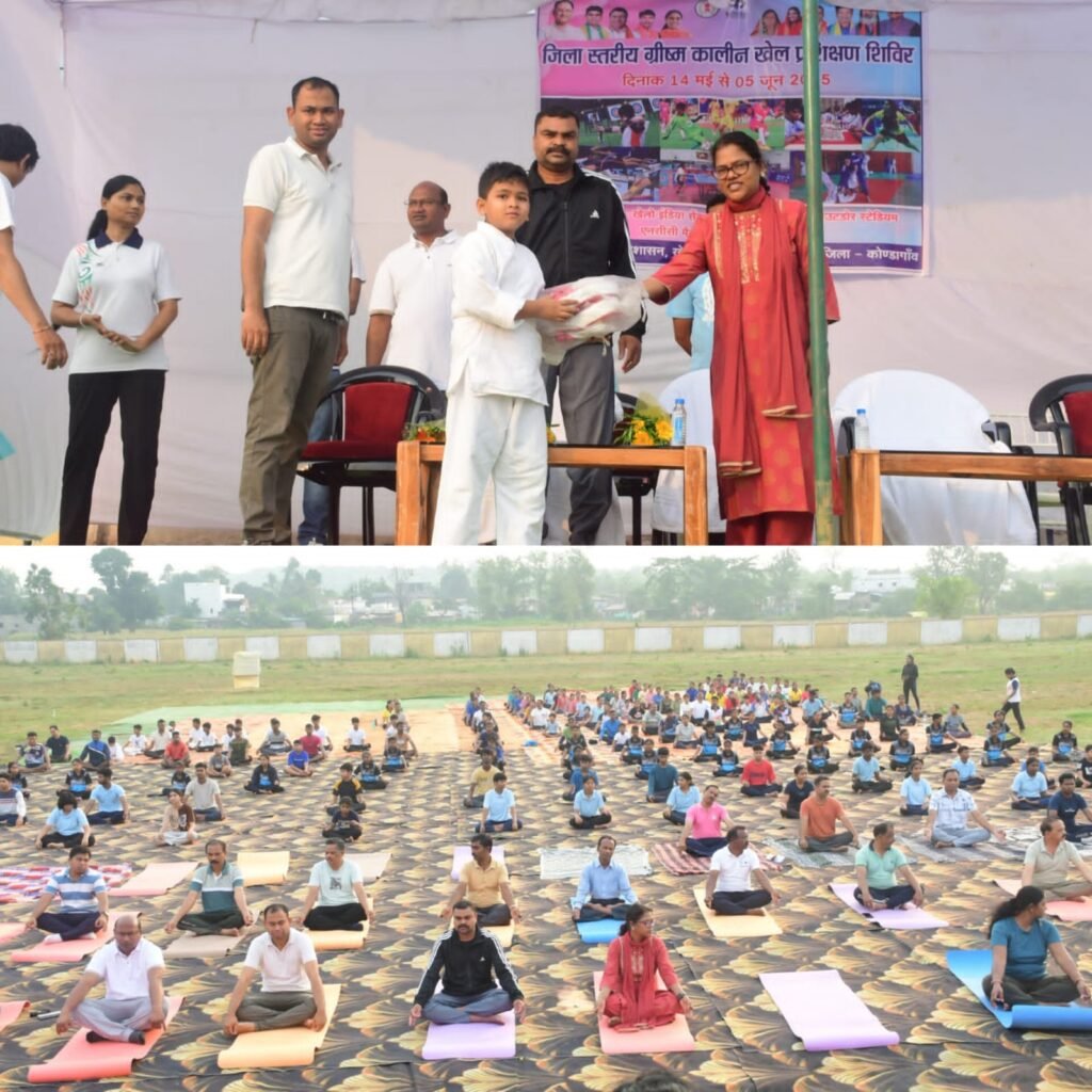 कोंडागांव – ग्रीष्मकालीन खेल प्रशिक्षण शिविर का आज सुबह खेलो इंडिया सेंटर में शुभारंभ हुआ, इस अवसर पर कलेक्टर श्रीमती नूपुर राशि पन्ना और नगर पालिका परिषद के उपाध्यक्ष जसकेतु उसेंडी उपस्थित रहे। शिविर की शुरुआत सामूहिक योगाभ्यास से हुई, जिसमें कलेक्टर, उपाध्यक्ष श्री उसेंडी, विभिन्न विभागों के अधिकारीगण एवं शिविर में भाग ले रहे प्रतिभागी शामिल हुए।