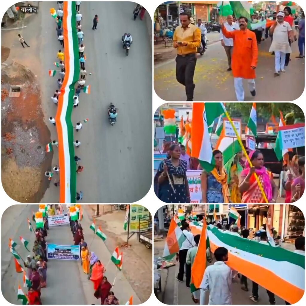देश के वीर जांबाज सैनिकों ने ऑपरेशन सिंदूर चलाकर आतंकियों की धरती पर उनके ठिकानों को नेस्तानाबूद कर पाकिस्तान के कार्यवाही का मुंहतोड़ जवाब देकर उनके सभी प्रयोगों को धराशायी किया भारतीय सैनिकों के अदम्य वीरता तथा साहस के सम्मान में बालोद के नागरिकों ने भव्य तिरंगा यात्रा का आयोजन किया जिसमें हर समाज वर्ग शासकीय सेवक वकील इंजीनियर डॉक्टर नगर पालिका के अधिकारी कर्मचारी सफाई दीदी सहित नगर के अनेक संगठनों के महिला पुरुष युवा शामिल हुए यात्रा में हर हाथ मे तिरंगा और देश के प्रति सम्मान का भाव झलक रहा था वहीं 165 फ़ीट लंबा तिरंगा को लोगो ने अपने हाथों में उठाया था जो अलग ही आकर्षण का केंद्र रहा डीजे की आवाज में देशभक्ति गीतों ने नगर में अलग ही माहौल बना दिया इस अवसर पर जिला भाजपा अध्यक्ष चेमन देशमुख बाल संरक्षण आयोग के पूर्व अध्यक्ष यशवंत जैन पालिका अध्यक्ष प्रतिभा चौधरी कृष्णकांत पवार यज्ञदत्त शर्मा राकेश छोटू यादव कमलेश सोनी ताराचंद सांखला चेतन ढ़ेलडिया हरीश सांखला मुकेश भंसाली शाहिद खान रवि पांडेय विनोद जैन लीला शर्मा हितेश्वरी कौशिक निशा योगी प्रीति देशमुख नूपुर सोनवानी प्राची लालवानी गोमती रात्रे अनुविभागीय अधिकारी राजस्व सुरेश साहू तहसीलदार आसुतोष शर्मा नगर पालिका अधिकारी सौरभ शर्मा थाना निररिक्षक रविशंकर पांडेय सहित अनेक गणमान्य नागरिक पार्षद जनपद सदस्य पत्रकार संघ के लोग शामिल थे
