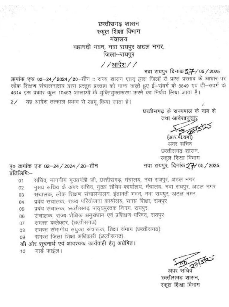 छत्तीसगढ़ के ई-संवर्ग के 5849 एवं टी-संवर्ग के 4614 शाला कुल 10463 शालाओं के युक्तियुक्तकरण करने शासन स्कूल शिक्षा विभाग ने किया आदेश जारी