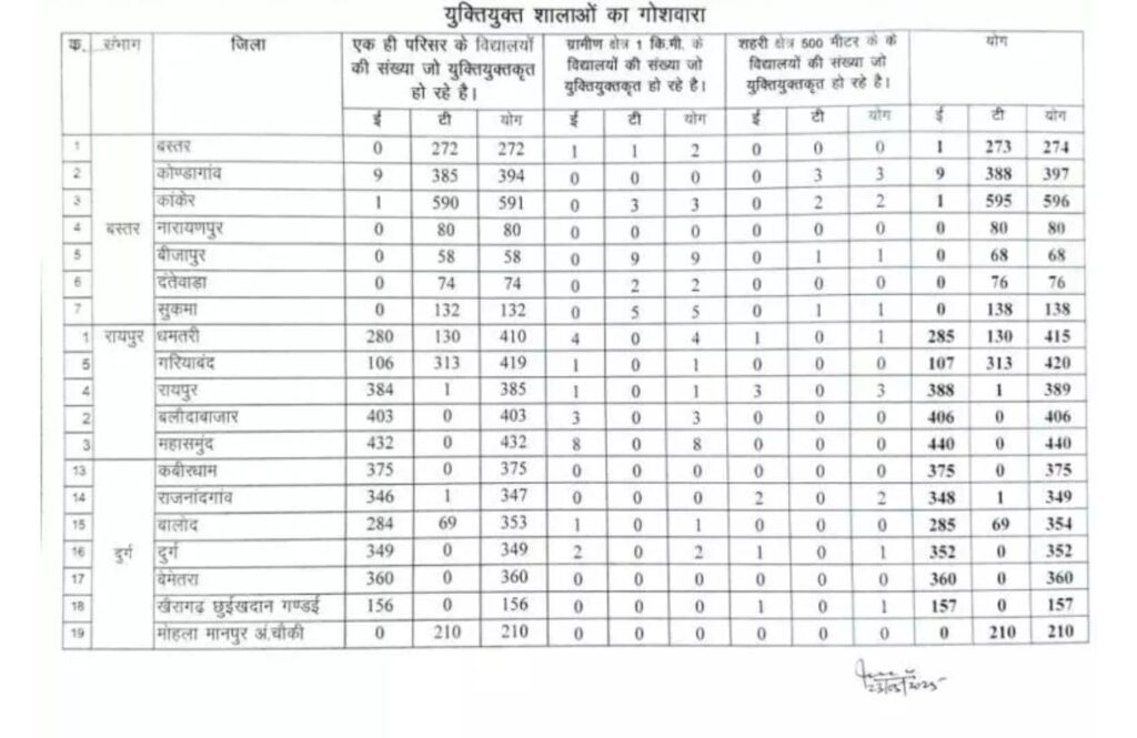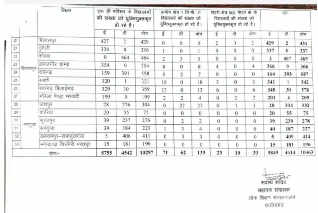 छत्तीसगढ़ के ई-संवर्ग के 5849 एवं टी-संवर्ग के 4614 शाला कुल 10463 शालाओं के युक्तियुक्तकरण करने शासन स्कूल शिक्षा विभाग ने किया आदेश जारी, देखे किस जिले में कितने स्कूल मर्ज किया गया