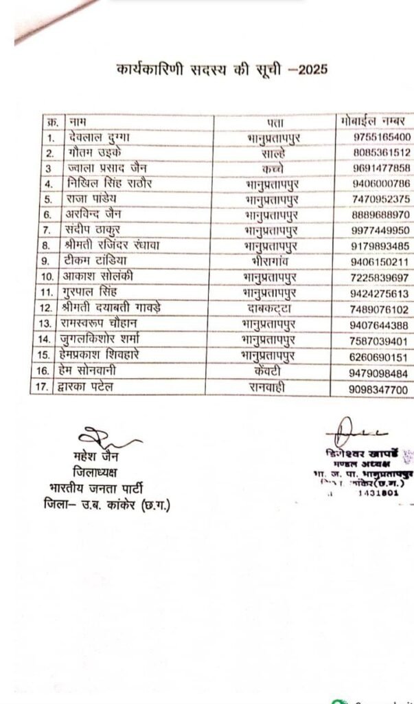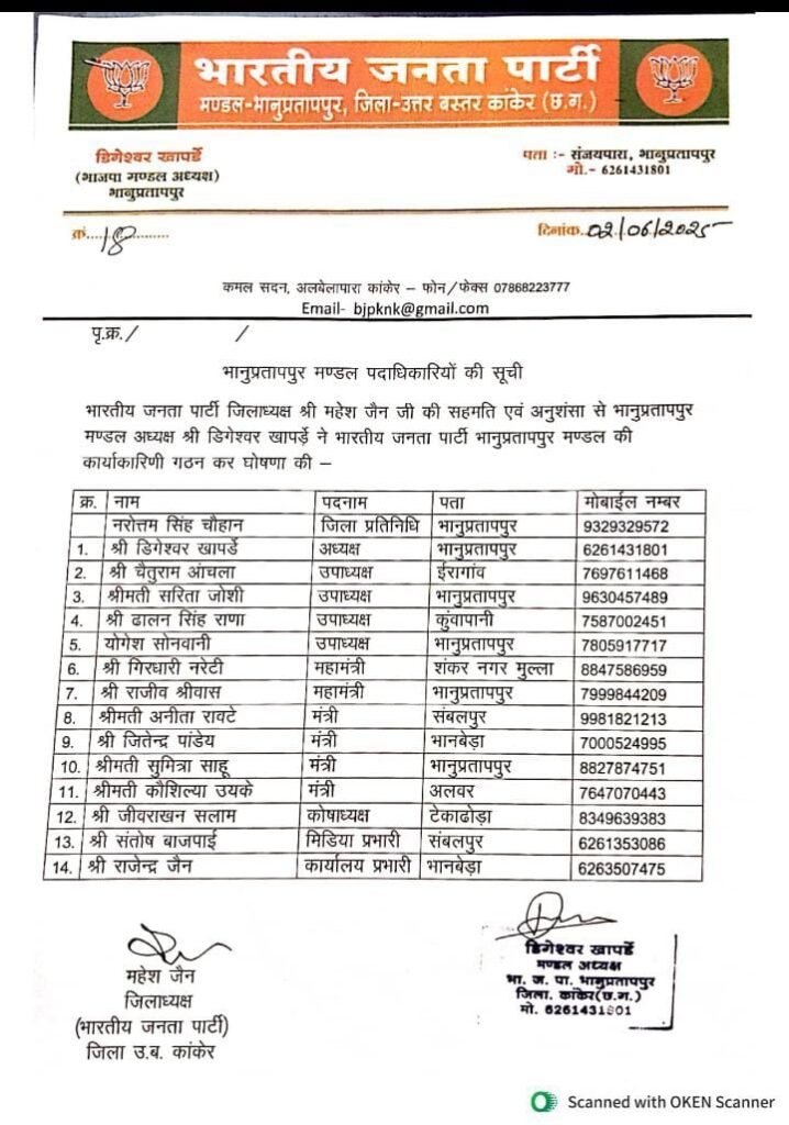 भारतीय जनता पार्टी ने मंडल भानुप्रतापपुर के नई कार्यकारिणी का घोषणा प्रदेश नेतृत्व के निर्देशानुसार जिलाध्यक्ष भाजपा महेश जैन ने कर दिया है, ज्ञात हो कि भारतीय जनता पार्टी ने नगरीय निकाय चुनाव के दौरान ही नए जिलाध्यक्ष और मंडल अध्यक्षों की नियुक्ति की थी परंतु पुराने कार्यकारणी के आधार पर ही मंडल भाजपा का संचालन हो रहा था चार महीने बाद प्रदेश एवं जिला नेतृत्व ने नई कार्यकारिणी की घोषणा कर दी है, मंडल अध्यक्ष डिगेश खापर्डे की नई कार्यकारिणी में ऊर्जावान चेहरों को जगह दी है, युवा मोर्चा के जिला पदाधिकारी रहे राजीव श्रीवास और भारतीय सेना से सेवानिवृत्त हवलदार और अनूसूचित जनजाति मोर्चा में मंडल महामंत्री रहे गिरधारी नरेटी को भाजपा मंडल महामंत्री का दायित्व सौंपा है जिला प्रतिनिधि के रूप में पूर्व मंडल अध्यक्ष नरोत्तम चौहान को स्थान दिया गया है वहीं चैतूराम आंचला,सरिता जोशी,ढलान सिंह राणा और योगेश सोनवानी उपाध्यक्ष के दायित्व का निर्वहन करेंगे मंडल मंत्री के दायित्व में जितेंद्र पांडे अनिता रावटे सुमित्रा साहू कौशल्या उइके रहेंगे कोषाध्यक्ष जीवरखान सलाम कार्यालय प्रभारी राजेंद्र जैन और मीडिया प्रभारी के रूप में संतोष बाजपेई को ज़िम्मेदारी मिली है ।