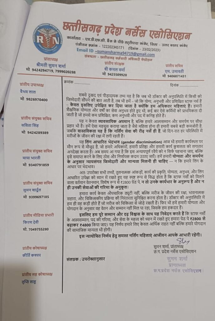 आज छत्तीसगढ़ प्रदेश नर्सेस एसोसिएशन का प्रतिनिधि मंडल देर शाम विभागीय मंत्री श्याम बिहारी जायसवाल से मिला जिसमें उनकी प्रमुख मांगों में एक थी वेतन विसंगति जो अन्य राज्यों में और केंद्र में नर्सों का ग्रेड पे वेतन मान छत्तीसगढ़ की तुलना में बहुत ज्यादा है अर्थात ग्रेड पे रु 4200 से 4800 तक है लेकिन वहीं छत्तीसगढ़ में नर्सों का ग्रेड पे वेतन मान प्रशिक्षण अवधि और शैक्षणिक योग्यता तथा कार्य की प्रकृति के मामले बहुत ही कम ,(रु 2800 )है जो अन्य राज्यों की और केंद्र की तुलना में बहुत कम है।जिसे केंद्र के समान या अन्य राज्यों की तरह वेतनमान ग्रेड पे छत्तीसगढ़ में भी नर्सों को देने की मांग की गई है ।वहीं दूसरी प्रमुख मांगों में नर्सों का पदनाम बदलकर नर्सिंग ऑफिसर किया जाने की मांग नर्सों ने रखी है ।प्रदेश अध्यक्ष सुमन शर्मा और प्रांतीय संयुक्त सचिव माया भारती ने अपने संयुक्त बयान में कहा कि नर्सिंग ऑफिसर पदनाम का संचालक द्वारा अनुमोदन सहित प्रस्ताव शासन को भेजा जा चुका है ।जिसके संबंध में नर्सेस एसोसिएशन ने अवर सचिव को भी पत्र लिखकर एवं मिलकर जल्द नर्सिंग ऑफिसर पदनाम का आदेश जारी करने के लिए अनुरोध किया है आज माननीय स्वास्थ्य मंत्री श्याम बिहारी जायसवाल जी ने भी इस मुद्दे को गंभीरता से लेते हुए त्वरित कार्यवाही करते हुए शासन को पत्र भेजकर जल्द से जल्द नर्सिंग ऑफिसर पदनाम की सौगात नर्सों को जल्द देने का नर्सेस एसोसिएशन के प्रतिनिधि मंडल को ठोस आश्वाशन दे दिया है।नर्सेस एसोसिएशन के पदाधिकारियों ने माननीय स्वास्थ्य मंत्रीजी के के ठोस आश्वाशन पर आभार जताया और प्रसन्नता जाहिर की और कहा कि अब वर्षों से जिस सम्मानजनक पदनाम का नर्सेस को इंतजार था समाप्त होने वाला है बहुत जल्द लिखेंगे नर्सेस अब अपना पदनाम *नर्सिंग ऑफिसर* ।