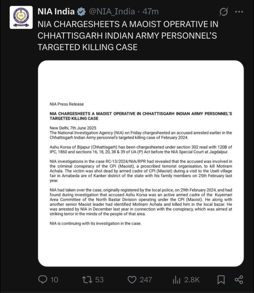 एनआईए ने इस मामले को, जो मूल रूप से स्थानीय पुलिस द्वारा दर्ज किया गया था, 29 फरवरी 2024 को अपने हाथ में लिया था. जांच के दौरान यह पाया गया कि आरोपी आशु कोरसा सीपीआई (माओवादी) के तहत संचालित उत्तर बस्तर डिवीजन की कुयेमारी क्षेत्र समिति का सक्रिय सशस्त्र कैडर था. उसने एक अन्य वरिष्ठ माओवादी नेता के साथ मिलकर मोतीराम अचला की पहचान की और स्थानीय बाजार में उसकी हत्या की. उसे पिछले साल दिसंबर में एनआईए द्वारा इस साजिश के संबंध में गिरफ्तार किया गया था, जिसका मकसद उस क्षेत्र के लोगों में दहशत फैलाना था ।