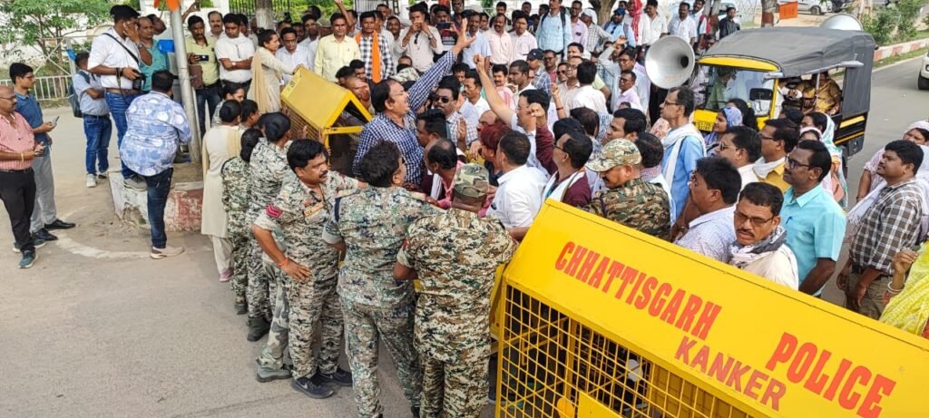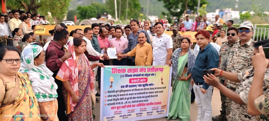 कांकेर शिक्षक साझा मंच के प्रांतीय आह्वान पर 10 जून को नया बस स्टैंड से रैली निकाल कर 3 बजे मुख्यमंत्री,शिक्षा सचिव, डीपीआई के नाम कलेक्टर कांकेर की अनुपस्थिति में नायब तहसीलदार को ज्ञापन सौंपा गया। ज्ञापन सौंपने के बाद शिक्षक कलेक्टर से मिलने के लिए अड़े रहें,कलेक्टर के प्रतिनिधि के तौर पर उपस्थित नायब तहसीलदार ने ऊपर बात कर जब यह बताया की कलेक्टर स्वास्थ्य मंत्री के कार्यक्रम में गए हैँ रात 9 -10 बज जायेगा, संघ पदाधिकारी व सी ई ओ, डीईओ के साथ बैठक बाद में आयोजित करवाने के आश्वासन पर शिक्षक हटे, जिसमें जिले भर के सैकड़ो शिक्षक शामिल थे, रैली से पहले शिक्षको का धरना स्थल में जमकर नारे बाजी की गई जिसमें जिले में अतिशेष सूची में हुई वरिष्ठता सूची में गड़बड़ी, दिव्यांग को अतिशेष के रूप में शामिल करने, महिलाओ द्वारा असहमति देने के बावजूद बिहड क्षेत्र में पति-पत्नी प्रकरण का भी ख्याल नहीं रखते हुए 150 से 200 किलोमीटर दूर एक तरफा पदास्थापना आदेश का विरोध किया गया, कांकेर जिले के सभी विकासखंड में विषय चक्रीकरण गणना में अलग-अलग मापदंड अपनाते हुए अपने चहेतो को बचा लिया गया साझा मंच के पदाधिकारीयों ने कहा कि राज्य शासन के युक्ति युक्तकरण निर्देश में साफ-साफ बिंदु क्रमांक 6 में उल्लेखित है कि सीधी भर्ती द्वारा नवनियुक्त शिक्षकों को गणना में शामिल नहीं किया जाना था किंतु उनके शामिल किए जाने से पुराने शिक्षक अतिशेष हो गए जो की गंभीर लापरवाही है इसी कारण कांकेर जिले से 550 से अधिक शिक्षक अतिशेष हो रहे हैं अतएव त्रुटि करने वाले दोषी अधिकारियो के खिलाफ कार्यवाही करते हुए दोषपूर्ण सूची को निरस्त करने की मांग की गई भरने के दौरान 2008 के सेटअप को लागू करने हेतु वह सभी शिक्षकों का यथावत कार्य करने देने की मांग की गई