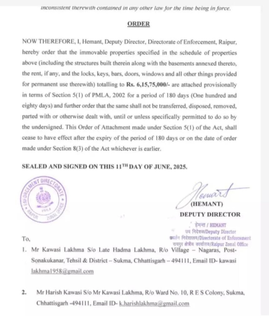 रायपुर / प्रवर्तन निदेशालय ने छत्तीसगढ़ शराब घोटाले पर आगे की कारवाई करते तत्कालीन आबकारी मंत्री कवासी लखमा के संपत्ति के अलावा सुकमा में 68 लाख रुपए के कांग्रेस भवन को अटैच किया है ,इसके साथ ही