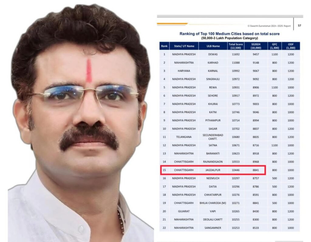 केंद्र सरकार द्वारा कराए गए स्वच्छता सर्वेक्षण 2024-25 में जगदलपुर शहर ने बड़ी छलांग लगाते हुए शीर्ष 100 शहरों में 107 वें स्थान से 15वां स्थान प्राप्त करके अपनी एक विशेष छाप छोड़ी है। स्वच्छता सर्वेक्षण में जगदलपुर को छत्तीसगढ़ में दूसरा स्थान प्राप्त हुआ है । जगदलपुर नगर ने कुल 12500 में से 10446 अंक अर्जित किये जिसमें स्वच्छता सर्वेक्षण 2024 में 10000 में से 8841, गार्बेज फ्री सिटी में1300 में से 800 और खुले में शौच मुक्त में 1200 में 1000 अंक प्राप्त किया है। इस उपलब्धि का श्रेय नगर निगम जगदलपुर के महापौर पाण्डेय ने जगदलपुर को जागरूक एवं सजग जनता को दिया है और इस उपलब्धि में उनकी सक्रीय सहभागिता व नगर को स्वच्छ एवं सुन्दर बनाने के लिए उनकी अपील का समर्थन किया है ।उसके लिए संजय पाण्डेय ने नगरवासियों के प्रति कृतज्ञता व्यक्त की है।