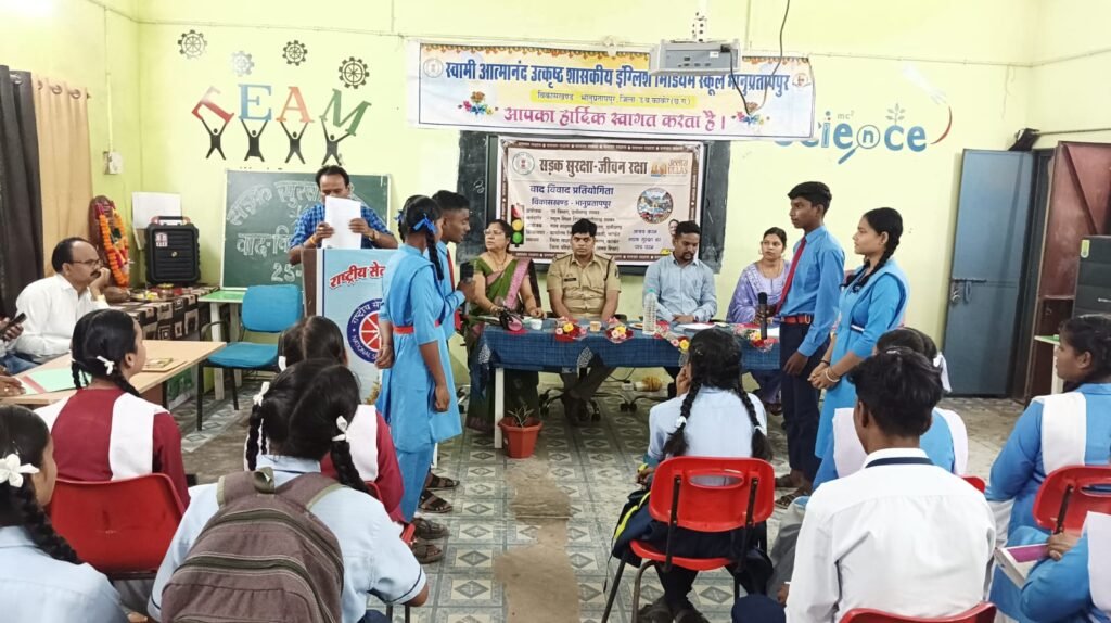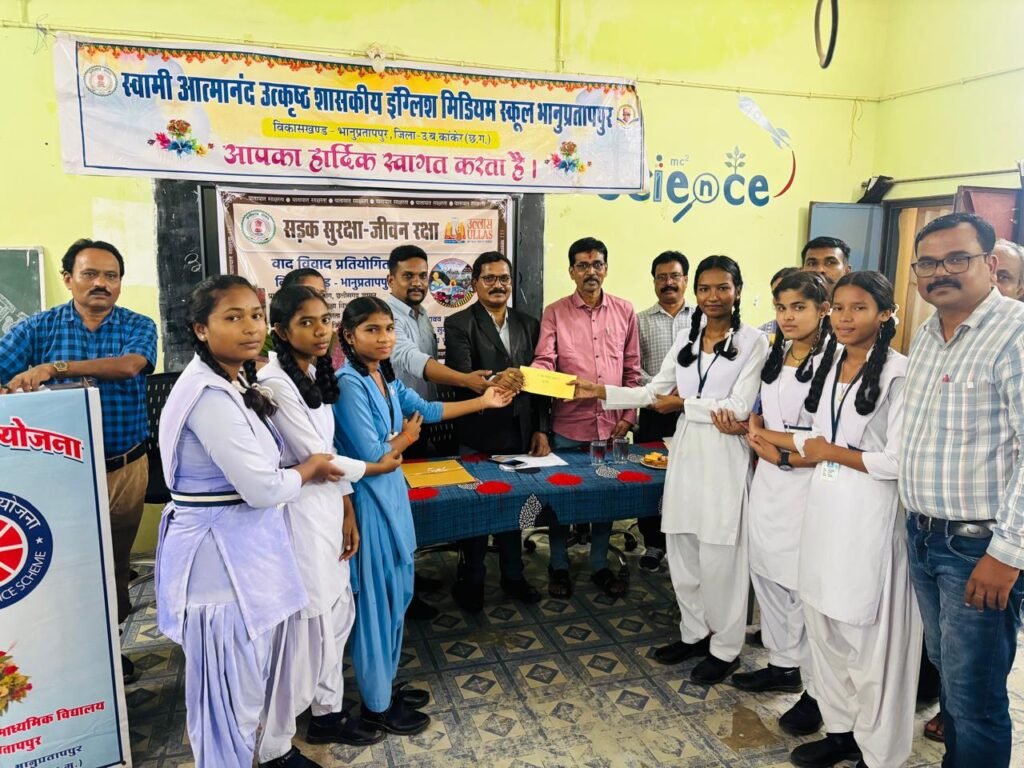 भानुप्रतापपुर@कलेक्टर एवं अध्यक्ष जिला साक्षरता मिशन प्राधिकरण कांकेर के निर्देशानुसार एवं मुख्य कार्यपालन अधिकारी जिला पंचायत ,जिला शिक्षा अधिकारी ,अनुविभागीय अधिकारी (रा) भानुप्रतापपुर ,जिला परियोजना अधिकारी ,खण्ड शिक्षा अधिकारी भानुप्रतापपुर के मार्गदर्शन में आज ब्लाॅक स्तरीय वाद विवाद प्रतियोगिता का आयोजन जिला शिक्षा अधिकारी रमेश निषाद के मुख्य आतिथ्य, सदेसिंह कोमरे खण्ड शिक्षा अधिकारी की अध्यक्षता एवं अनिल बालेश्वर उप निरीक्षक थाना भानुप्रतापपुर के विशिष्ट आतिथ्य में किया गया। प्रतियोगिता का विषय था – ‘‘सड़क सुरक्षा जीवन रक्षा था’’ जिसमें बच्चों ने काफी बढ़चढ़ कर हिस्सा लिया। कार्यक्रम का शुभारंभ माता सरस्वती के पून के पश्चात प्रारंभ किया गया। जिला शिक्षा अधिकारी रमेश निषाद ने अपने उदबोधन में यातायात सुरक्षा के महत्व पर प्रकाश डालते हुए कहा कि जिस तरह हम लोग स्कूल में अनुशासन का पालन करना जरूरी है उसी तरह हम यदि यातायात नियमों का पालन करें तो कभी दुर्घटना नहीं होगी। उन्होने सीट बेल्ट हेलमेट और नाबालिग बच्चों को गाडी न चलाने की सलाह दी। खण्ड शिक्षा अधिकारी सदे सिंह कोमरे ने कहा कि यातायात नियमों पर जागरूकता बहुत जरूरी है अतः सभी अपने अपने आसपास एवं पालकों को भी जागरूक करें। अपने संबोधन में उप निरीक्षक अनिल बालेश्वर ने यातायात नियमों पर प्रकाश डालते हुए कहा कि बाईक या कार चलाते समय मोबाईल का प्रयोग न करें । सभी हेलमेट अच्छी क्वालिटी का प्रयोग करें साथ ही साथ 18 साल के कम उम्र के बच्चे गाडी न चलाये साथ ही साथ गाडी को सीमित स्पीड मे ंचलाये। आज विकासखण्ड भानुप्रतापपुर के 15 विदृयालय के बच्चों ने वाद विवाद प्रतियोगिता पर सडक सुरक्षा जीवन रक्षा विषय पर पक्ष एवं विपक्ष पर अपनी राय रखी और सभी बच्चों ने अच्छी प्रस्तुति दी। आज विकास खण्ड स्तरीय वाद विवाद प्रतियोगिता में बच्चों को पुरूस्कृत भी किया गया। प्रथम स्थान भावेश नाग एवं दल सेजेस हिन्दी माध्यम भानुप्रतापपुर को 2500.00, द्वितीय कुमारी खुशबू साहू एव ंदल शासकीय उच्चतर माध्यमिक शाला सेलेगांव को 2000.00, तृतीय कुमारी प्रेरणा साहू एव ंदल शासकीय उच्चतर माध्यमिक शाला बैजनपुरी को 1500.00 प्रदान किया गया।