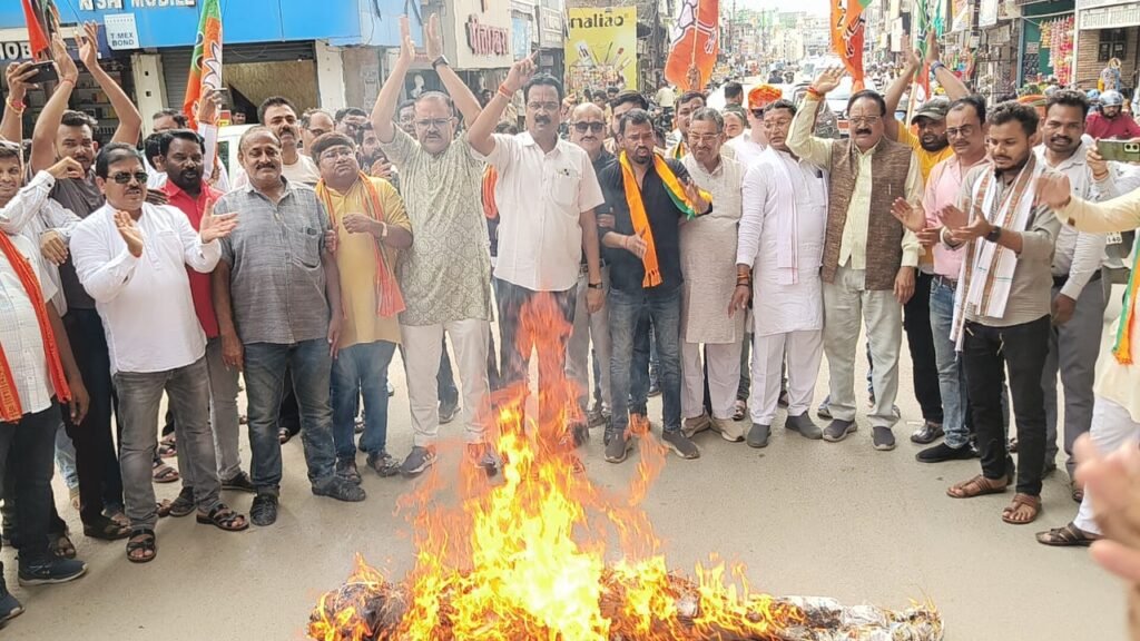 कांकेर। भारत के प्रधानमंत्री नरेन्द्र मोदी व उनकी दिवंगत माताश्री के खिलाफ बिहार में कांग्रेस नेता राहूल गांधी व राजद के नेताओं द्वारा अपशब्दों व अभद्र भाषा, गाली गलौच करने के विरोध में आज भारतीय जनता युवा मोर्चा के तत्वाधान में भाजपा प्रदेश उपाध्यक्ष सतीश लाटिया, भाजपा जिलाध्यक्ष महेश जैन, भाजपा प्रदेश प्रवक्ता टेकेश्वर जैन, भाजपा जिला महामंत्री दिलीप जायसवाल, पूर्व भाजपा जिलाध्यक्ष हलधर साहू, नगर पालिका अध्यक्ष अरूण कौशिक, उपाध्यक्ष उत्तम यादव की उपस्थिति तथा भाजपा युवा मोर्चा जिलाध्यक्ष राजा पाण्डेय के नेतृत्व में कांग्रेस नेता राहूल गांधी व राजद नेता तेजस्वी यादव का कांकेर के पुराने बस स्टेण्ड में पुतला दहन किया गया। पुतला दहन से पहले युवा मोर्चा द्वारा राहूल गांधी व तेजस्वी यादव का शवयात्रा पुराने बस स्टेण्ड से मस्जिद तक निकाली गई । शवयात्रा के दौरान युवा मोर्चा द्वारा राहूल गांधी व तेजस्वी यादव के खिलाफ नारे भी लगाये गये।