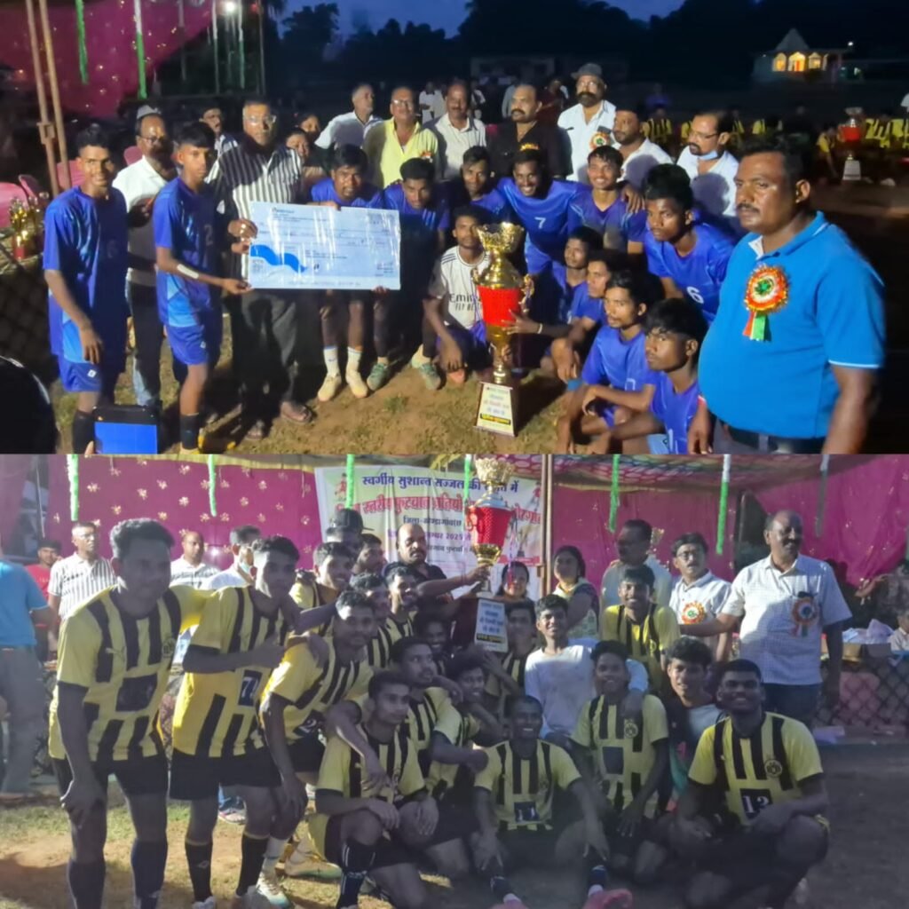 फरसगांव – ब्लॉक के ग्राम पंचायत बोरगांव स्व सुशांत सज्जल की स्मृति में बोरगांव के फुटबॉल क्लब के द्वारा जिला स्तरीय फुटबॉल प्रतियोगिता का आयोजन किया गया था। इस प्रतियोगिता का समापन रविवार की दोपहर 3 बजे मुख्य अतिथि अशोक उसेंडी उपाध्यक्ष छग फुटबॉल संघ भिलाई सहित स्थानीय जनप्रतिनिधियों की उपस्थिति में किया गया । इस प्रतियोगिता मे जिले के कुल 12 टीमों ने भाग लिया। इस प्रतियोगिता का अंतिम फाइनल मैच वीर गुंडाधुर क्लब बनियागांव और जयगुरु वन बोरगांव टीम में मध्य खेला गया। फाइनल मैच बहुत ही रोमांचक रहा । फाइनल मैच 90 मिनट का दो पारियो में खेला गया। फाइनल मैच में दोनों टीमों ने 1-1 गोल दागे । जिससे मैच बराबर हो गया। जिसके बाद 15 मिनट का एक्स्ट्रा टाइम का खेल हुआ। जिसमें दोनों टीम एक भी गोल नहीं दागे पाए । जिसके बाद पेनल्टी शूट आउट हुआ। जिसमें बनियागांव की टीम ने 4 गोल दागे और वन बोरगांव की टीम ने 3 गोल ही दागे पाई । इस तरह एक गोल से वीर गुंडाधुर की टीम ने इस प्रतियोगिता में जीत हासिल कर खिताब पर कब्जा कर लिया ।