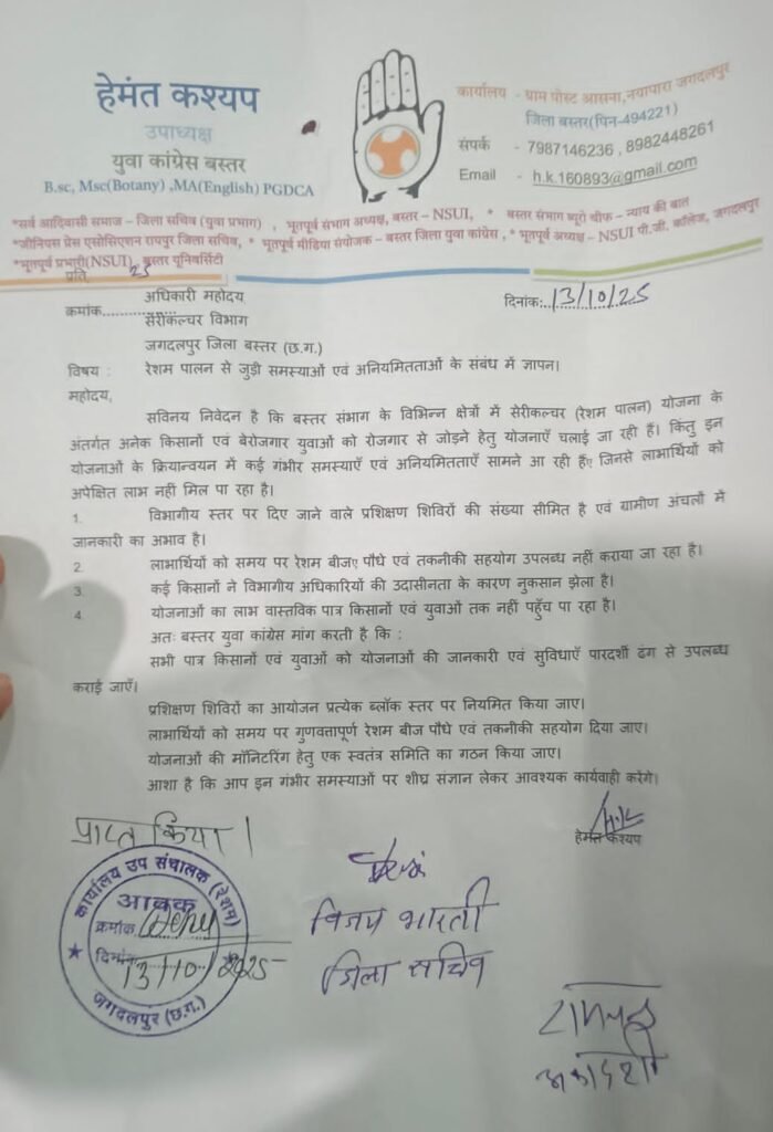 ज्ञापन में बताया गया कि बस्तर संभाग के विभिन्न क्षेत्रों में रेशम पालन योजना के अंतर्गत किसानों और बेरोजगार युवाओं को रोजगार से जोड़ने की दिशा में कार्य किए जा रहे हैं, लेकिन योजनाओं के क्रियान्वयन में गंभीर लापरवाहियाँ सामने आ रही हैं। इन खामियों के कारण लाभार्थियों को योजनाओं का पूर्ण लाभ नहीं मिल पा रहा है और किसानों को आर्थिक नुकसान झेलना पड़ रहा है।