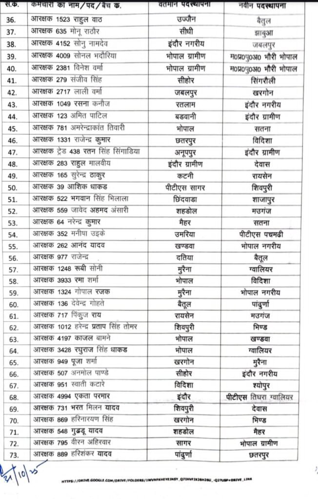 उमरिया=मध्यप्रदेश पुलिस मुख्यालय (PHQ) ने आरक्षक और महिला आरक्षकों के थोक में तबादले किए हैं, जिसमें उमरिया जिले से मनीषा उईके को पीटीएस पचमढ़ी भेजा गया है[9]। इस तबादला आदेश के तहत कई पुलिसकर्मियों का स्थानांतरण प्रदेश के अलग-अलग पुलिस प्रशिक्षण केंद्रों (PTS) में किया गया है, ताकि प्रशिक्षण व्यवस्था और कार्यशैली को और बेहतर बनाया जा सके PHQ के आदेश के अनुसार, आरक्षकों के समूह में तबादले किए गए हैं, जिसमें महिला आरक्षक भी शामिल हैं मनीषा उईके का स्थानांतरण उमरिया से पीटीएस पचमढ़ी प्रशिक्षण केन्द्र में किया गया है मध्यप्रदेश पुलिस में कुल आठ प्रमुख प्रशिक्षण केंद्र हैं, जिनमें रीवा, उमरिया और पचमढ़ी शामिल हैं