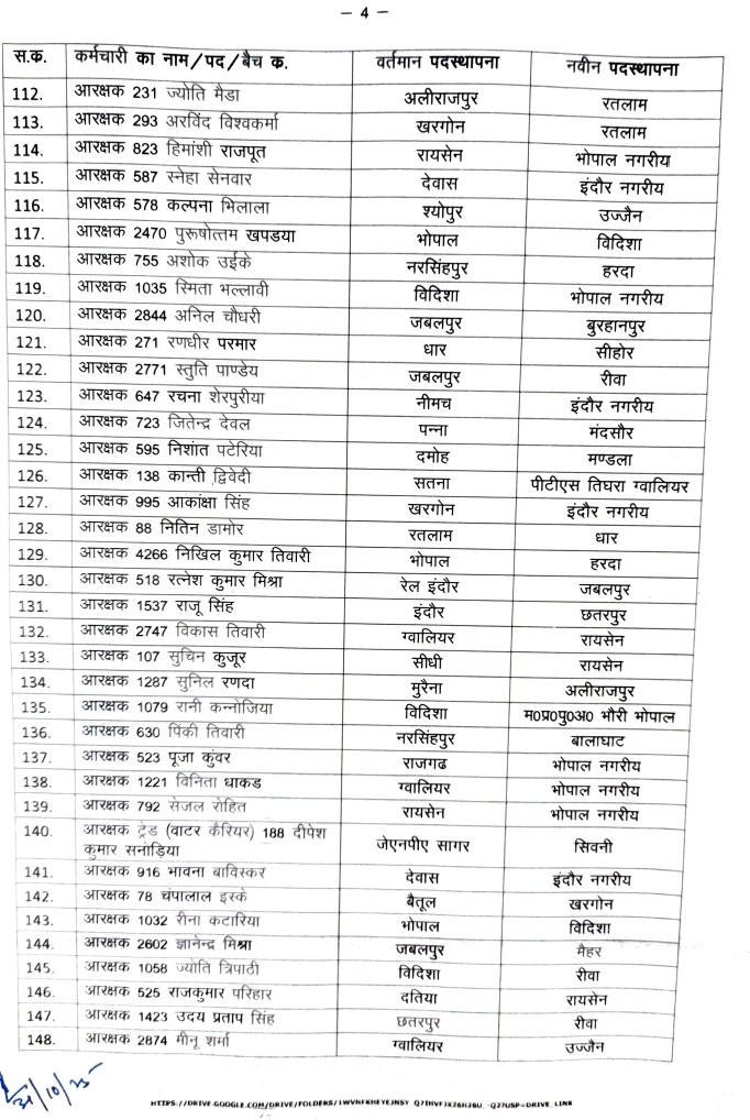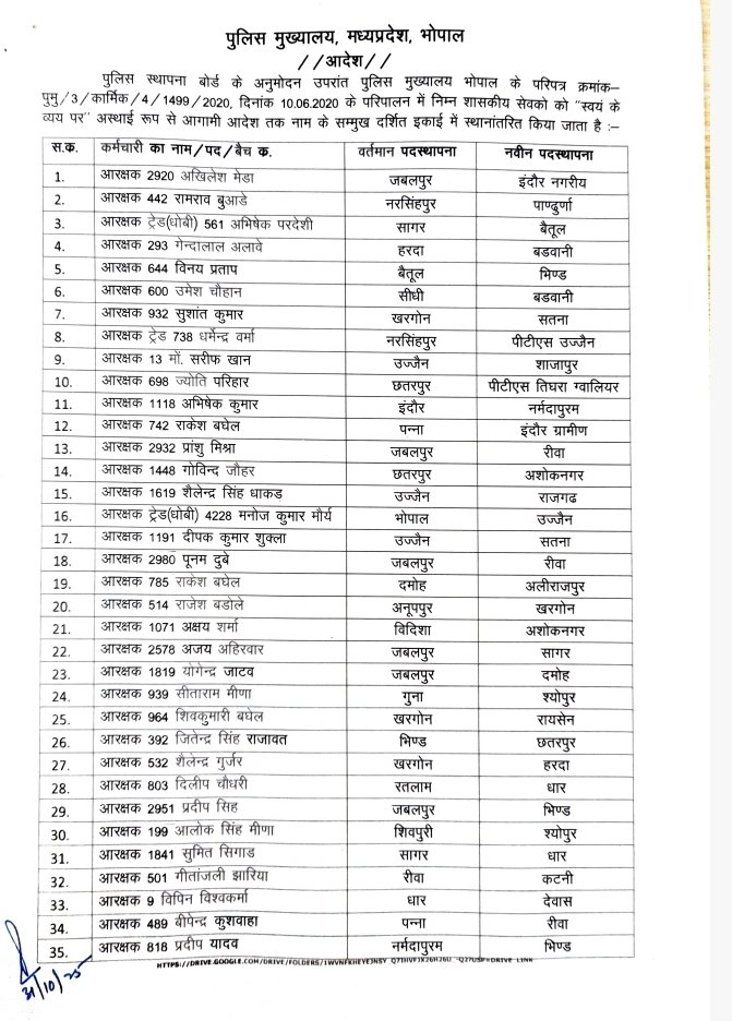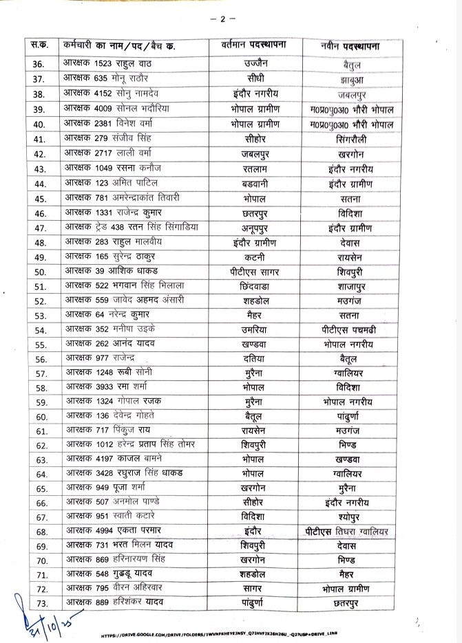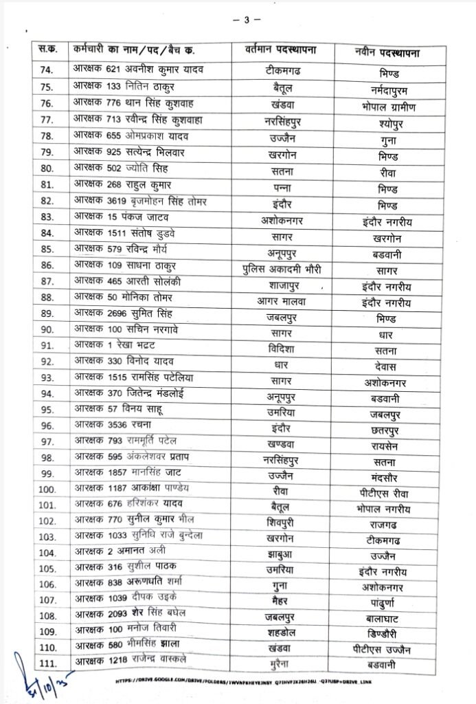 उमरिया=मध्यप्रदेश पुलिस मुख्यालय (PHQ) ने आरक्षक और महिला आरक्षकों के थोक में तबादले किए हैं, जिसमें उमरिया जिले से मनीषा उईके को पीटीएस पचमढ़ी भेजा गया है इस तबादला लिस्ट के तहत कई पुलिसकर्मियों को एक जिले से अन्य जिलों में ट्रांसफर किया गया है जिससे पुलिस व्यवस्था और दुरुस्त हो सके एवं लिस्ट में देखिए किन पुलिस कर्मियों को किस जिले भेजा गया है
