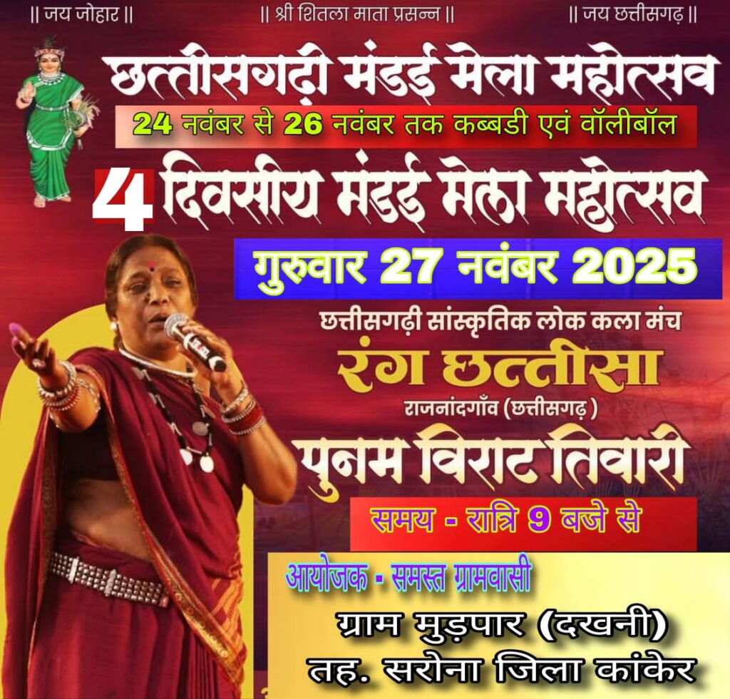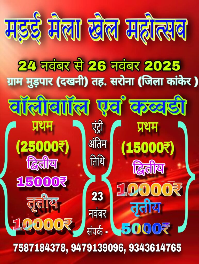 कांकेर। पारंपरिक संस्कृति और ग्रामीण खेलों को बढ़ावा देने के उद्देश्य से इस वर्ष ग्राम मुड़पार (दखनी) में मड़ई मेला महोत्सव का भव्य आयोजन समस्त ग्रामवासी ग्राम मुड़पार (दखनी ) के द्वारा किया जा रहा है। कार्यक्रम के तहत 24 से 26 नवंबर 2025 तक पुरुष वर्ग की वॉलीबॉल और कबड्डी प्रतियोगिता का आयोजन होगा, जिसमें बस्तर संभागीय भर की टीमें भाग लेंगी।