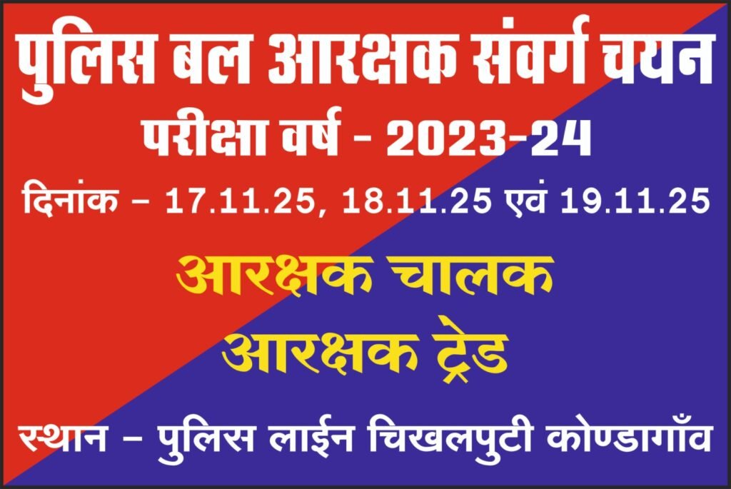 पुलिस मुख्यालय अटल नगर नया रायपुर के आदेशानुसार छत्तीसगढ़ पुलिस बल के आरक्षक भर्ती परीक्षा वर्ष 2023 / 24 के अंतर्गत आरक्षक (चालक) एवं आरक्षक (ट्रेड )की अभ्यर्थीयो का ट्रेड टेस्ट *दिनांक 17 /11/ 25 ,18/11/25 एवं 19 / 11/25* को आयोजित किया जाना है