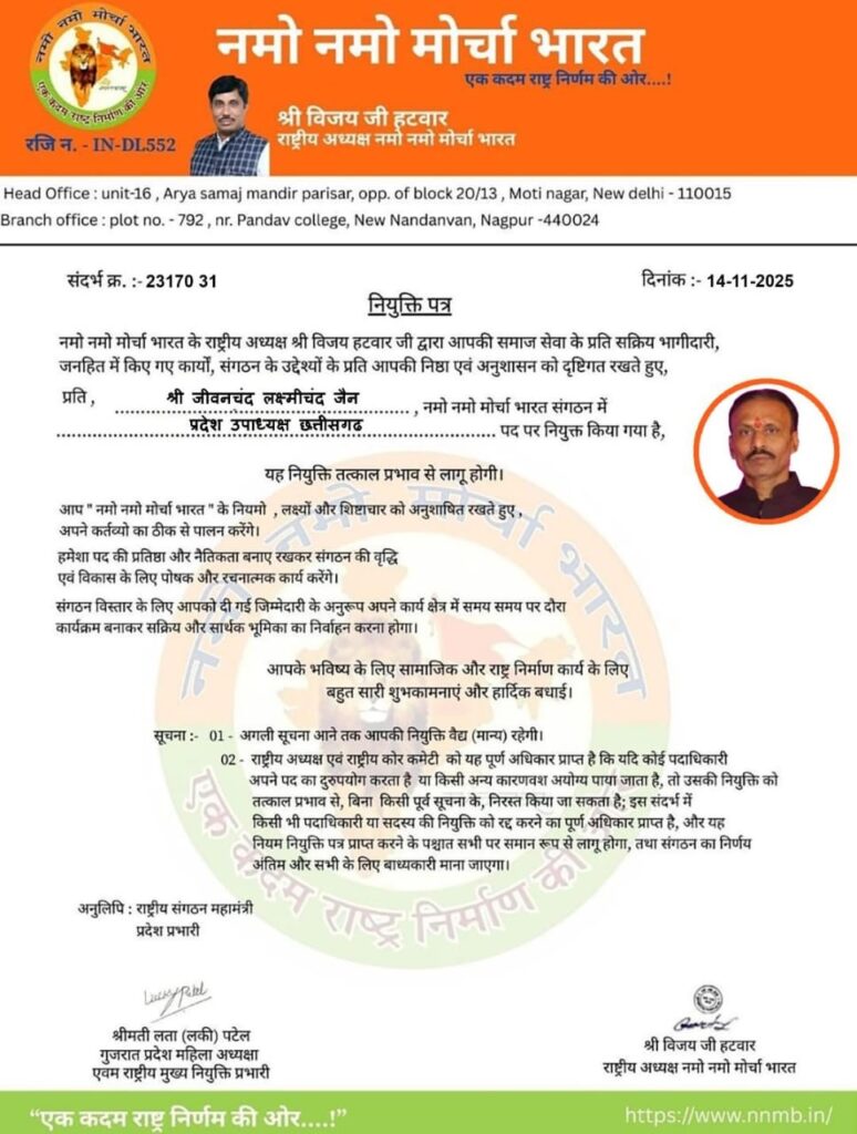 जीवन झाबक जैन “नमो नमो मोर्चा भारत” के उपाध्यक्ष बनाए गए