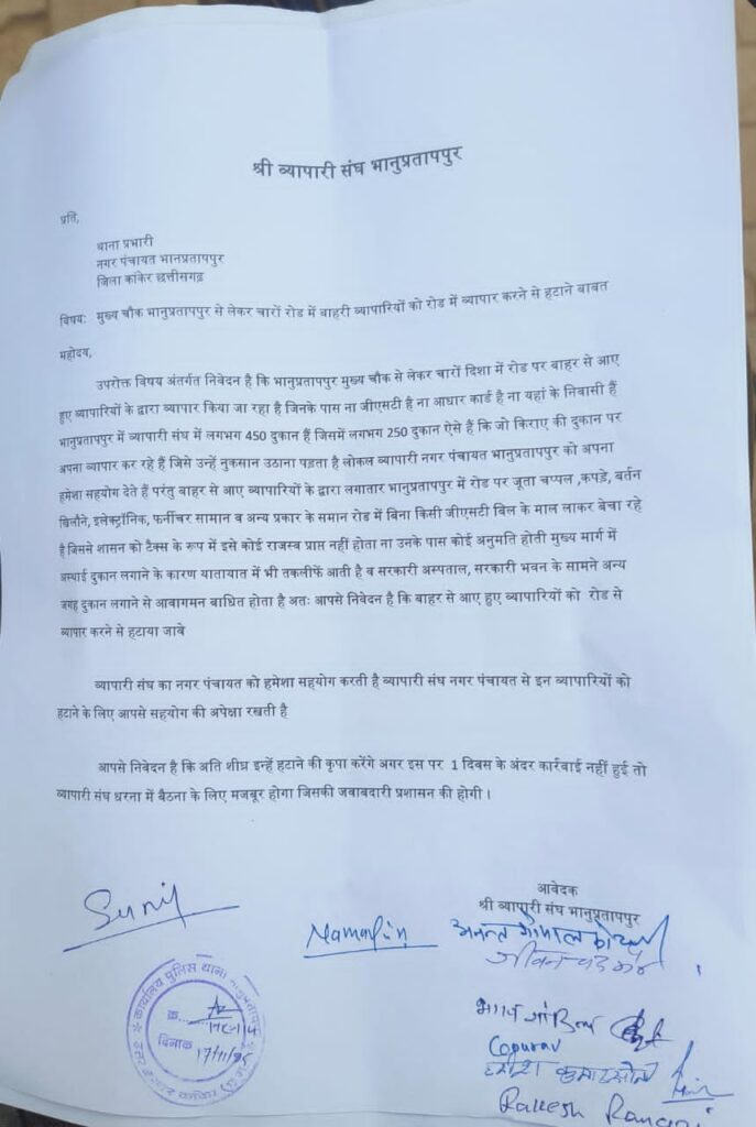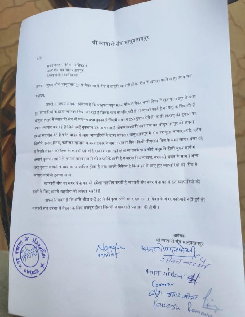 भानुप्रतापपुर मुख्य चौक से लेकर चारों दिशाओं में सड़क किनारे अवैध रूप से दुकानें लगाने वाले बाहरी व्यापारियों के खिलाफ कार्रवाई की मांग को लेकर व्यापारी संघ भानुप्रतापपुर ने आज नगर पंचायत और थाना प्रभारी को आवेदन सौंपा है। संघ का कहना है कि बाहर से आए कई व्यापारी बिना जीएसटी, बिना आधार कार्ड और बिना किसी स्थानीय पहचान के सड़कों पर जूते-चप्पल, कपड़े, बर्तन, खिलौने, इलेक्ट्रॉनिक व फर्नीचर सहित अन्य सामान बेच रहे हैं, जिससे स्थानीय कारोबार प्रभावित हो रहा है।