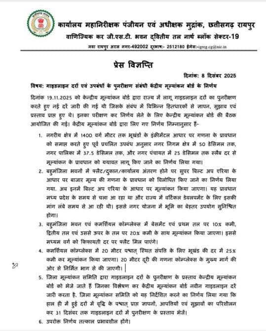 छत्तीसगढ़ में गाइडलाइन दरों का बड़ा बदलाव — केंद्रीय मूल्यांकन बोर्ड ने जारी किए नए उपबंध, आम जनता और रियल एस्टेट सेक्टर को मिलेगी राहत