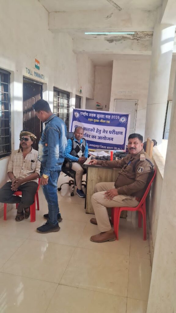 जगदलपुर। सड़क दुर्घटनाओं की रोकथाम और यातायात सुरक्षा को ध्यान में रखते हुए आज दिनांक 8 जनवरी 2026 को राष्ट्रीय राजमार्ग-30 पर टोल प्लाजा के पास वाहन चालकों का नेत्र परीक्षण शिविर आयोजित किया गया। यह शिविर पुलिस अधीक्षक बस्तर श्री शलभ कुमार सिन्हा के निर्देश एवं अतिरिक्त पुलिस अधीक्षक श्री महेश्वर नाग के मार्गदर्शन में संपन्न हुआ।