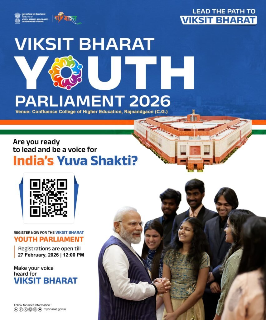 राजनांदगांव/छ.ग – विकसित भारत यूथ पार्लियामेंट 2026 के तहत जिला स्तरीय प्रतियोगिता का आयोजन खेल एवं युवा कल्याण मंत्रालय भारत सरकार के निर्देशन में माय भारत राजनादगांव एवं कॉन्फ्लुएंस कॉलेज की राष्ट्रीय सेवा योजना के संयुक्त तत्वाधान में, किया जाना है। प्रतियोगिता का उद्देश्य युवाओं को राष्ट्रीय चर्चाओं में हिस्सा लेने और विकसित भारत@2047 के विज़न में योगदान देने के लिए प्रेरित करना है।